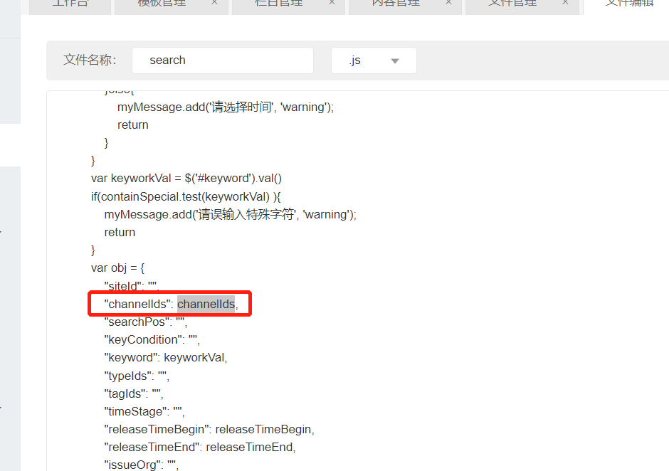 channelIds可能是在js写的,但是这个模板并没有接收地址栏的这个参数channelIds,所以直接在地址上这么写接口请求并没有带这个参数 |