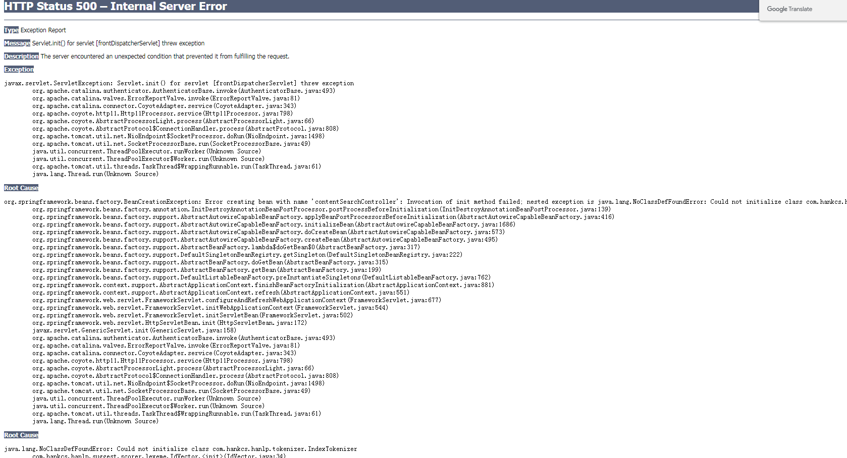 ![]() at org.springframework.beans.factory.support.AbstractAutowireCapableBeanFactory.initializeBean(AbstractAutowireCapableBeanFactory.java:1686) at org.springframework.beans.factory.support.AbstractAutowireCapableBeanFactory.doCreateBean(AbstractAutowireCapableBeanFactory.java:573) at org.springframework.beans.factory.support.AbstractAutowireCapableBeanFactory.createBean(AbstractAutowireCapableBeanFactory.java:495) at org.springframework.beans.factory.support.AbstractBeanFactory.lambda$doGetBean$0(AbstractBeanFactory.java:317) at org.springframework.beans.factory.support.DefaultSingletonBeanRegistry.getSingleton(DefaultSingletonBeanRegistry.java:222) at org.springframework.beans.factory.support.AbstractBeanFactory.doGetBean(AbstractBeanFactory.java:315) at org.springframework.beans.factory.support.AbstractBeanFactory.getBean(AbstractBeanFactory.java:199) at org.springframework.beans.factory.support.DefaultListableBeanFactory.preInstantiateSingletons(DefaultListableBeanFactory.java:762) at org.springframework.context.support.AbstractApplicationContext.finishBeanFactoryInitialization(AbstractApplicationContext.java:881) at org.springframework.context.support.AbstractApplicationContext.refresh(AbstractApplicationContext.java:551) at org.springframework.web.servlet.FrameworkServlet.configureAndRefreshWebApplicationContext(FrameworkServlet.java:677) at org.springframework.web.servlet.FrameworkServlet.initWebApplicationContext(FrameworkServlet.java:544) at org.springframework.web.servlet.FrameworkServlet.initServletBean(FrameworkServlet.java:502) at org.springframework.web.servlet.HttpServletBean.init(HttpServletBean.java:172) at javax.servlet.GenericServlet.init(GenericServlet.java:158) at org.apache.catalina.core.StandardWrapper.initServlet(StandardWrapper.java:1142) at org.apache.catalina.core.StandardWrapper.allocate(StandardWrapper.java:789) at org.apache.catalina.core.StandardWrapperValve.invoke(StandardWrapperValve.java:134) at org.apache.catalina.core.StandardContextValve.invoke(StandardContextValve.java:96) at org.apache.catalina.authenticator.AuthenticatorBase.invoke(AuthenticatorBase.java:493) at org.apache.catalina.core.StandardHostValve.invoke(StandardHostValve.java:137) at org.apache.catalina.valves.ErrorReportValve.invoke(ErrorReportValve.java:81) at org.apache.catalina.core.StandardEngineValve.invoke(StandardEngineValve.java:87) at org.apache.catalina.connector.CoyoteAdapter.service(CoyoteAdapter.java:343) at org.apache.coyote.http11.Http11Processor.service(Http11Processor.java:798) at org.apache.coyote.AbstractProcessorLight.process(AbstractProcessorLight.java:66) at org.apache.coyote.AbstractProtocol$ConnectionHandler.process(AbstractProtocol.java:808) at org.apache.tomcat.util.net.NioEndpoint$SocketProcessor.doRun(NioEndpoint.java:1498) at org.apache.tomcat.util.net.SocketProcessorBase.run(SocketProcessorBase.java:49) at java.util.concurrent.ThreadPoolExecutor.runWorker(Unknown Source) at java.util.concurrent.ThreadPoolExecutor$Worker.run(Unknown Source) at org.apache.tomcat.util.threads.TaskThread$WrappingRunnable.run(TaskThread.java:61) at java.lang.Thread.run(Unknown Source) Caused by: java.lang.NoClassDefFoundError: Could not initialize class com.hankcs.hanlp.tokenizer.IndexTokenizer at com.hankcs.hanlp.suggest.scorer.lexeme.IdVector.<init>(IdVector.java:34) at com.hankcs.hanlp.suggest.scorer.lexeme.IdVectorScorer.generateKey(IdVectorScorer.java:25) at com.hankcs.hanlp.suggest.scorer.lexeme.IdVectorScorer.generateKey(IdVectorScorer.java:20) at com.hankcs.hanlp.suggest.scorer.BaseScorer.addSentence(BaseScorer.java:52) at com.jeecms.common.util.MySuggester.addSentence(MySuggester.java:66) at com.jeecms.front.controller.ContentSearchController.initSuggestSentence(ContentSearchController.java:240) at sun.reflect.NativeMethodAccessorImpl.invoke0(Native Method) at sun.reflect.NativeMethodAccessorImpl.invoke(Unknown Source) at sun.reflect.DelegatingMethodAccessorImpl.invoke(Unknown Source) at java.lang.reflect.Method.invoke(Unknown Source) at org.springframework.beans.factory.annotation.InitDestroyAnnotationBeanPostProcessor$LifecycleElement.invoke(InitDestroyAnnotationBeanPostProcessor.java:366) at org.springframework.beans.factory.annotation.InitDestroyAnnotationBeanPostProcessor$LifecycleMetadata.invokeInitMethods(InitDestroyAnnotationBeanPostProcessor.java:309) at org.springframework.beans.factory.annotation.InitDestroyAnnotationBeanPostProcessor.postProcessBeforeInitialization(InitDestroyAnnotationBeanPostProcessor.java:136) ... 34 more 22-Dec-2021 16:09:36.336 严重 [http-nio-9956-exec-2] org.apache.catalina.core.StandardWrapperValve.invoke Allocate exception for servlet [frontDispatcherServlet] java.lang.NoClassDefFoundError: Could not initialize class com.hankcs.hanlp.tokenizer.IndexTokenizer at com.hankcs.hanlp.suggest.scorer.lexeme.IdVector.<init>(IdVector.java:34) at com.hankcs.hanlp.suggest.scorer.lexeme.IdVectorScorer.generateKey(IdVectorScorer.java:25) at com.hankcs.hanlp.suggest.scorer.lexeme.IdVectorScorer.generateKey(IdVectorScorer.java:20) at com.hankcs.hanlp.suggest.scorer.BaseScorer.addSentence(BaseScorer.java:52) at com.jeecms.common.util.MySuggester.addSentence(MySuggester.java:66) at com.jeecms.front.controller.ContentSearchController.initSuggestSentence(ContentSearchController.java:240) at sun.reflect.NativeMethodAccessorImpl.invoke0(Native Method) at sun.reflect.NativeMethodAccessorImpl.invoke(Unknown Source) at sun.reflect.DelegatingMethodAccessorImpl.invoke(Unknown Source) at java.lang.reflect.Method.invoke(Unknown Source) at org.springframework.beans.factory.annotation.InitDestroyAnnotationBeanPostProcessor$LifecycleElement.invoke(InitDestroyAnnotationBeanPostProcessor.java:366) at org.springframework.beans.factory.annotation.InitDestroyAnnotationBeanPostProcessor$LifecycleMetadata.invokeInitMethods(InitDestroyAnnotationBeanPostProcessor.java:309) at org.springframework.beans.factory.annotation.InitDestroyAnnotationBeanPostProcessor.postProcessBef