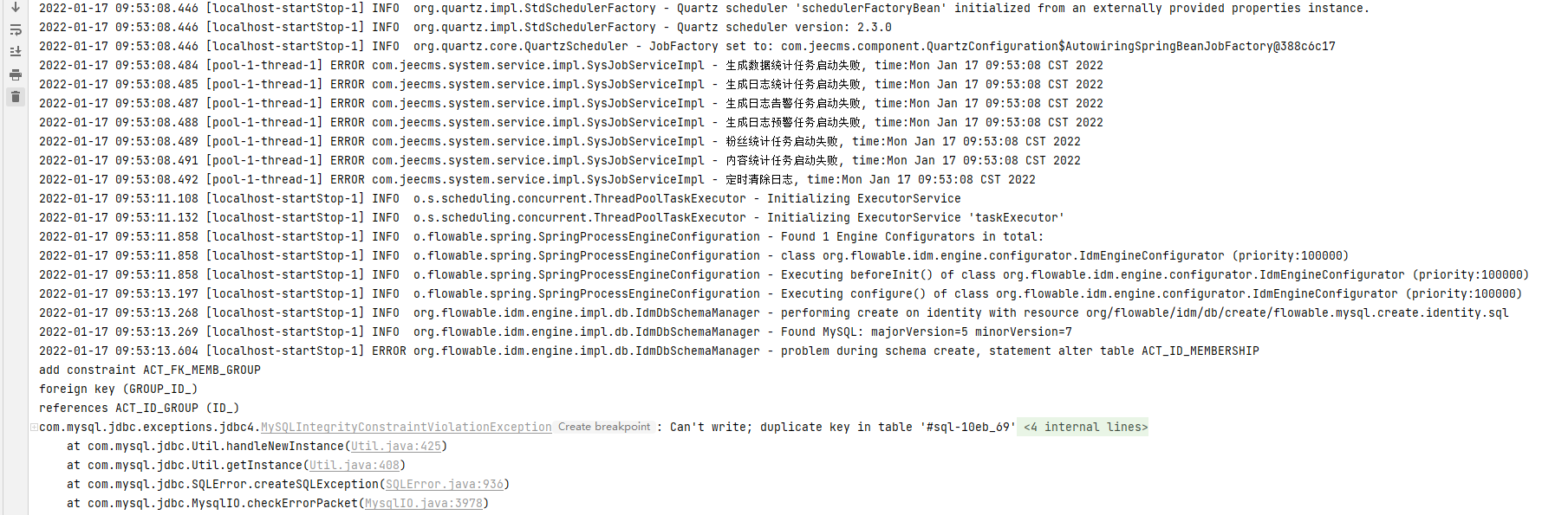 2022-01-17 09:53:08.491 [pool-1-thread-1] ERROR com.jeecms.system.service.impl.SysJobServiceImpl - 内容统计任务启动失败, time:Mon Jan 17 09:53:08 CST 2022