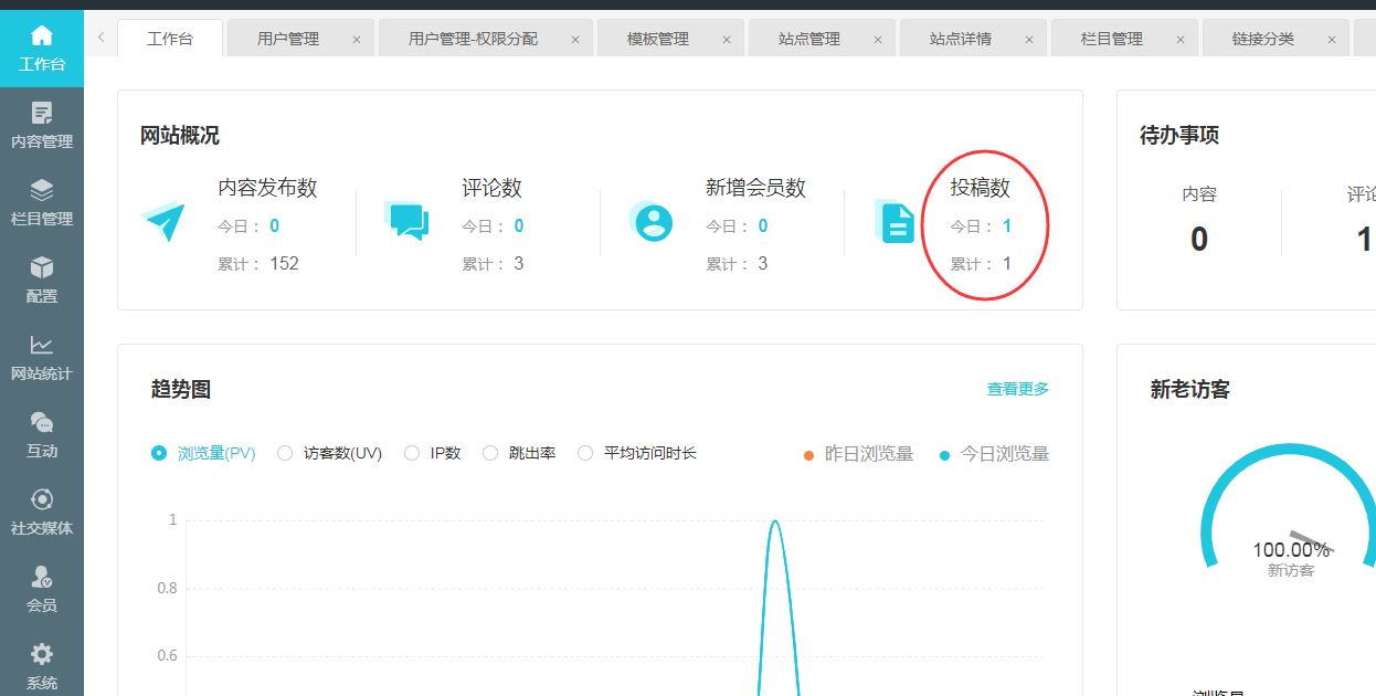 前台投稿统计在会员中心 我的投稿里面 |