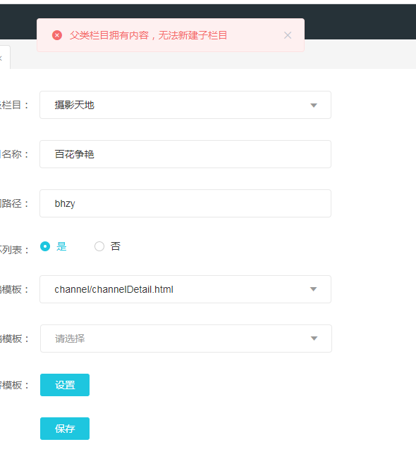 不是提示了很清楚嘛?父栏目下有内容  不能建子栏目,需要把父栏目内容先移动到别的栏目或者删除