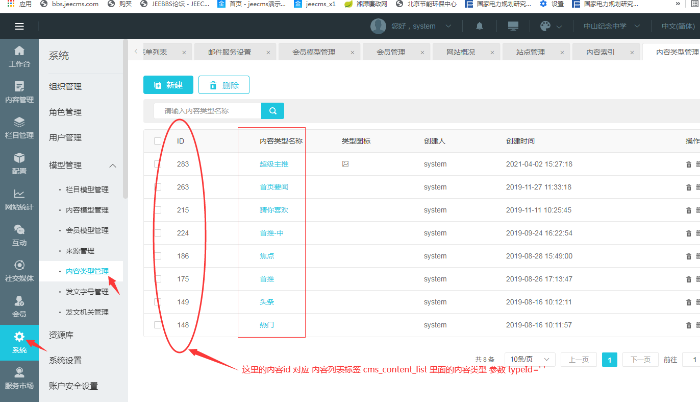 每个 内容列表标签里面 [@cms_content_list channelPath='yw,gn,gj,cj,ty' typeId='186' orderBy='2' siteId='1'] typeId 对应内容类型