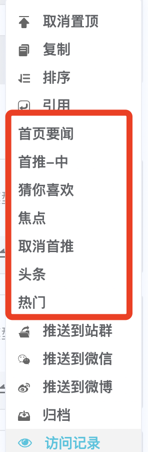 内容推送到首页是否可自定义,在哪里自定义?目前“首页要闻、首推、焦点、头条、热点”等几个推荐选项看不明白分别是推送到什么位置的 ![]() |