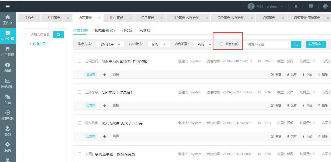 目前只在内容管理栏目看到能够勾选到 【我创建的】选项,在用户管理里面的权限管理没有找到对应的权限,可以具体说一下吗