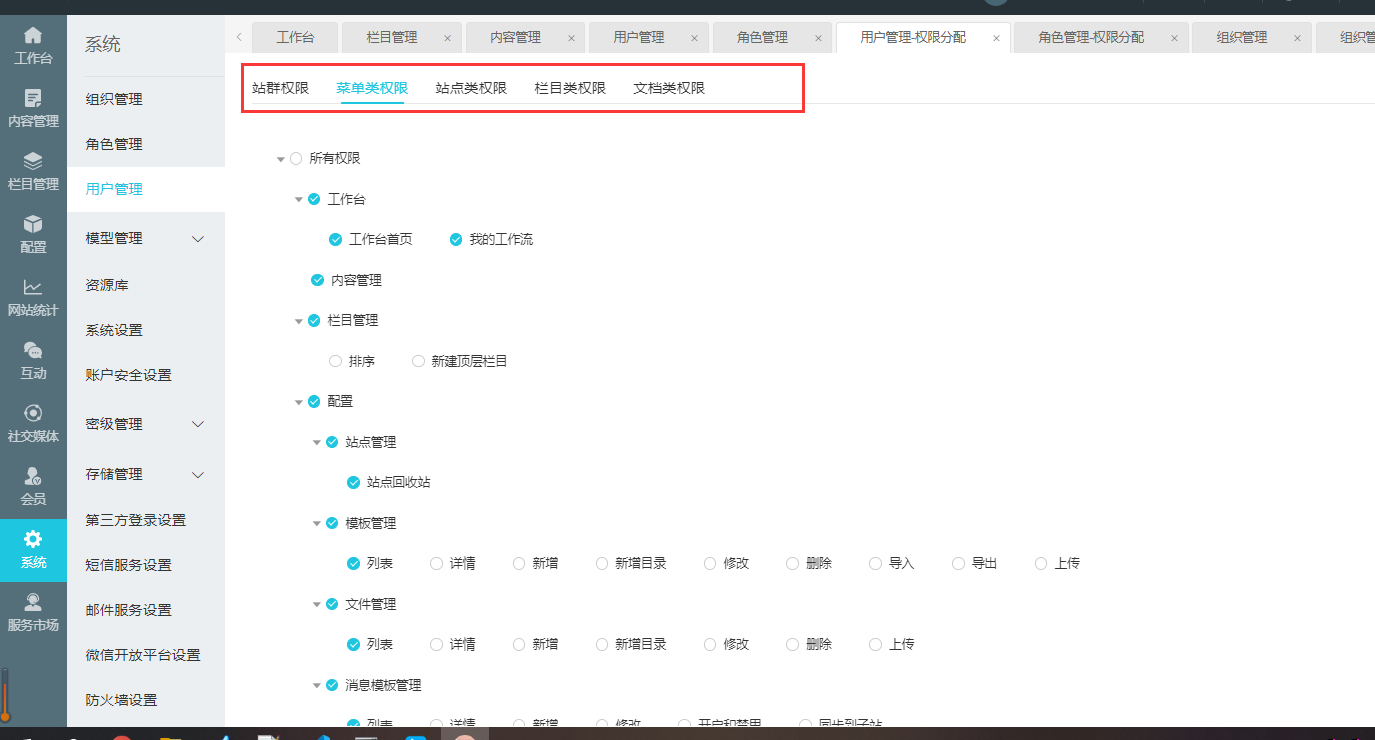 权限管理里面没有设置只看自己数据,权限管理设置的是看栏目 和文档权限,看自己数据可以用密级功能实现 要高级版本支持