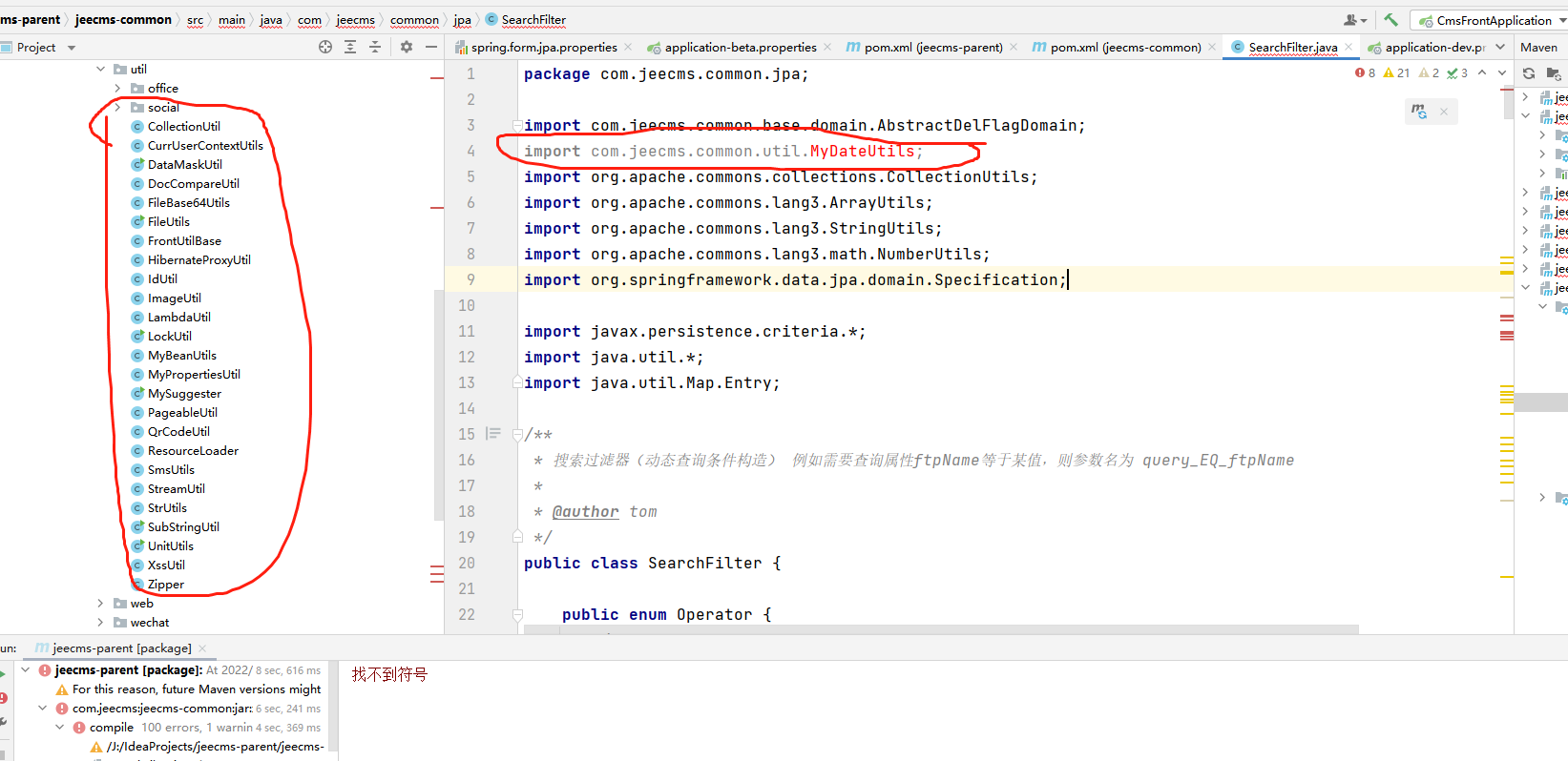 ![]() jee-common项目util包里面,没有MyDateUtils这个类。。。。 |