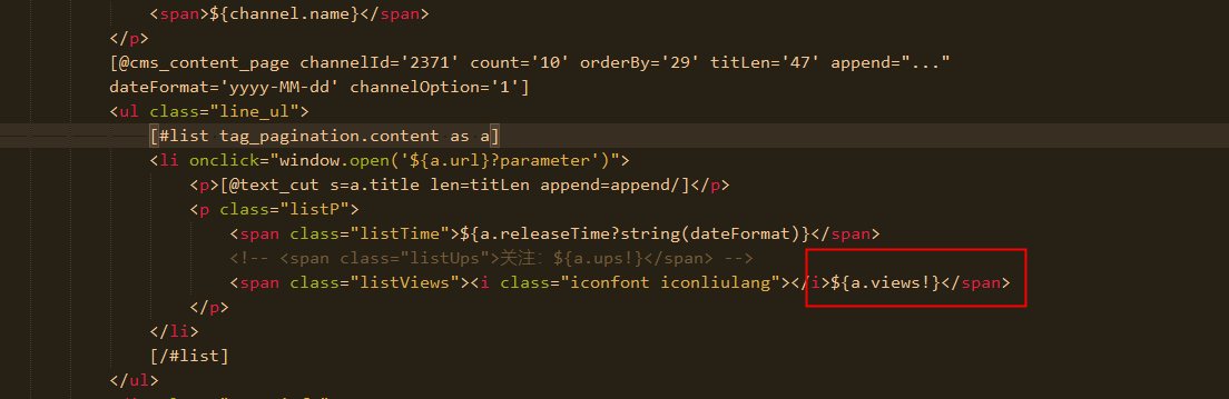 截图看下 参考这段代码 <script src="${res}/js/front.js" type="text/javascript" charset="utf-8"></script> <span id="views"></span> 内容浏览量元素 <script type="text/javascript"> $(function() { Cms.viewCount("${base}", "${content.id}"); }); </script> |