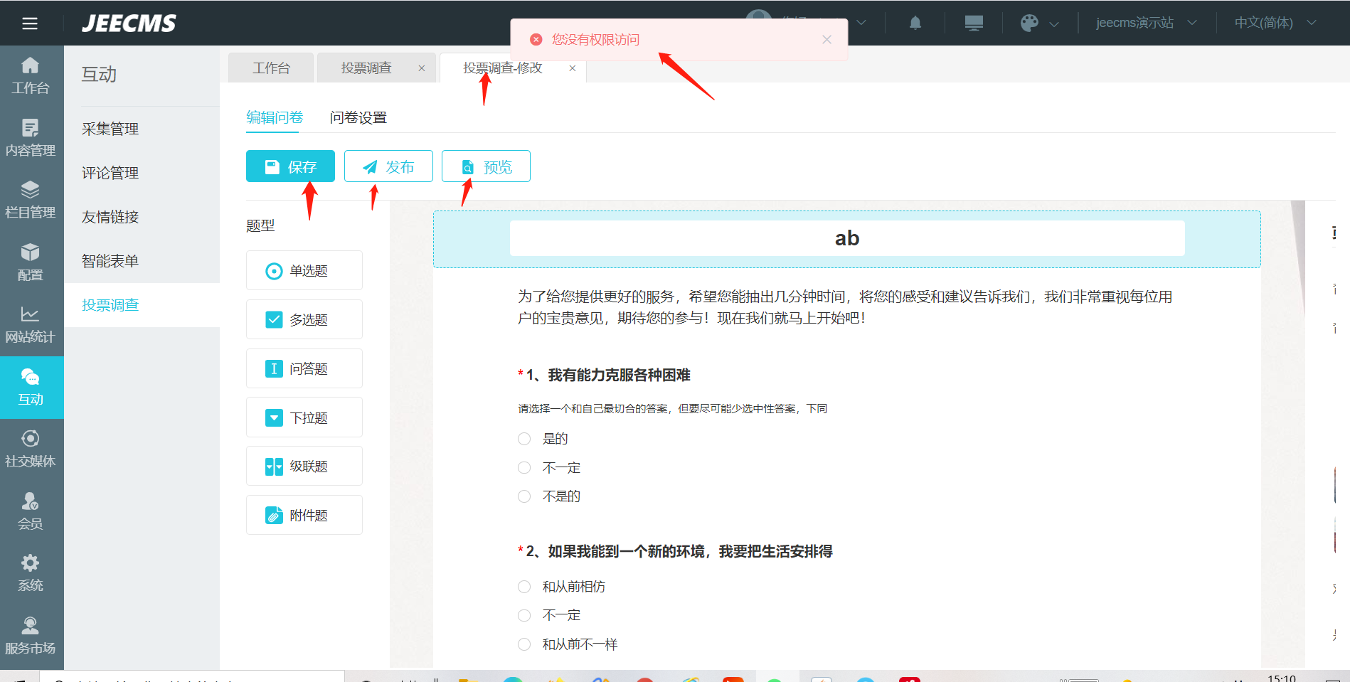 jeecms v1.11 智能投票在修改调查问卷时总是提示没有权限。