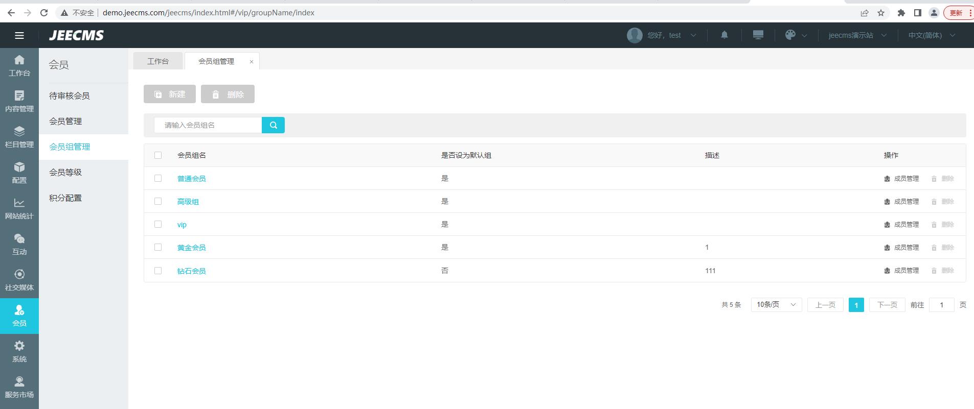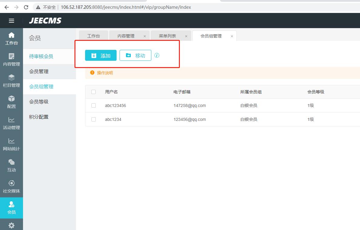 你们官网的演示地址也是这样的,点击会员组管理,一进来的时候应该是显示下面这个页面,然后点击成员管理才是到成员的添加和移动那个页面,现在调整完之后第一个页面直接不见了。 ![]() |