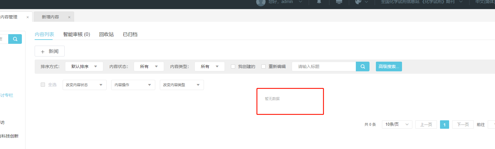 点击内容管理,右侧内容列表无数据;点击某个栏目,右侧内容列表也是无数据;