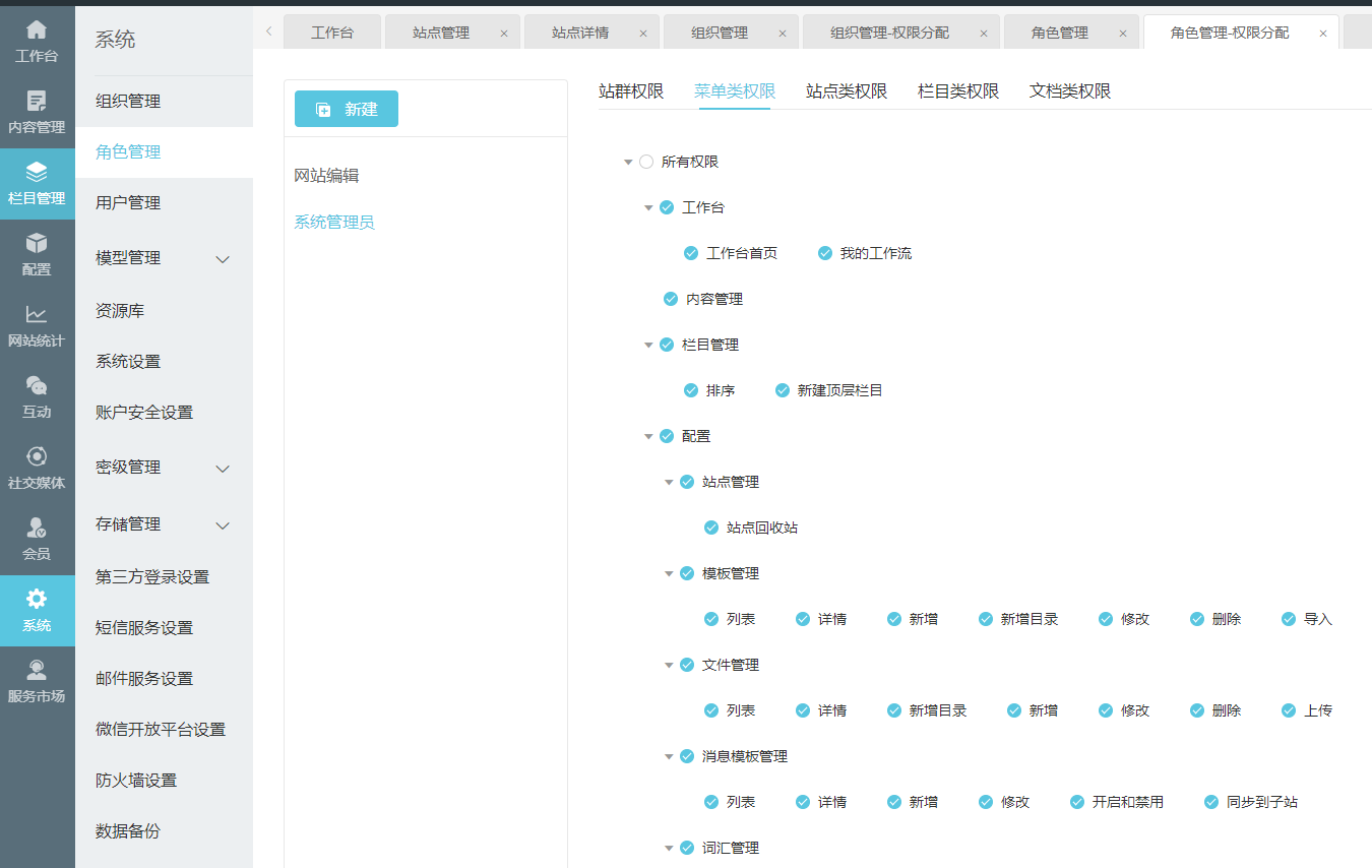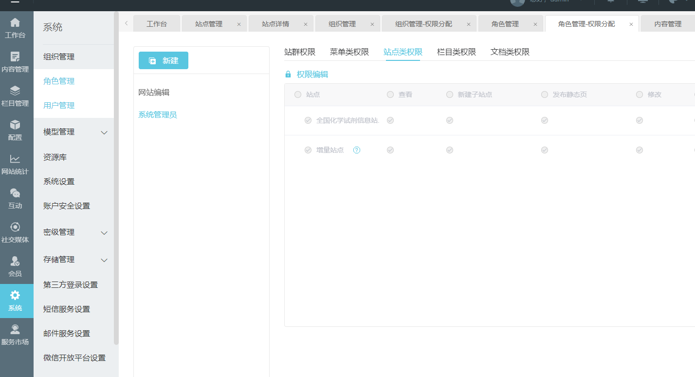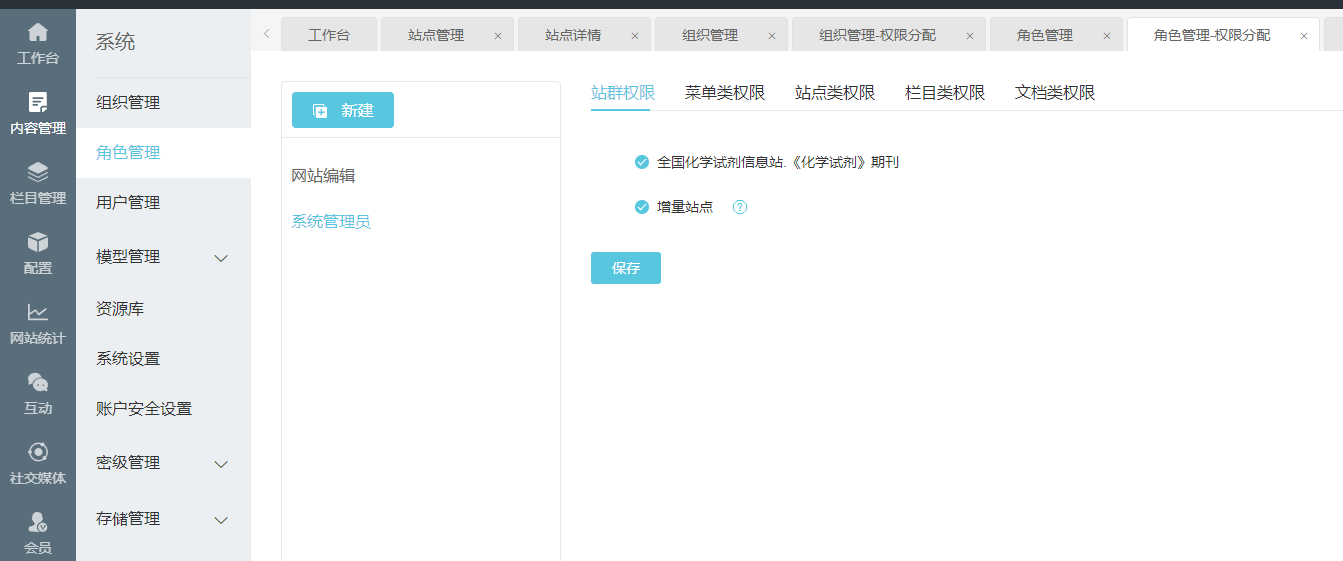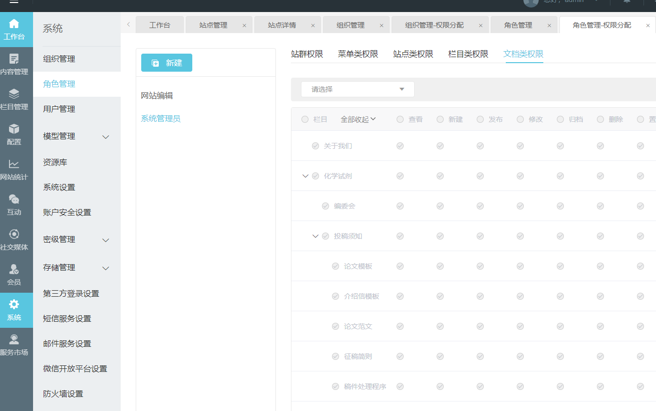 我调试到后台发现是角色权限的原因: 我是这样处理的: 我手动在 数据库 加了一个角色,然后把在后台系统里把配置角色权限(站群权限全部勾选保存、菜单类权限全选保存;站点类、栏目类、文档类权限 点进去是灰的无法保存) 然后把在 数据库 里给系统管理员用户加了该角色,就会出现上述的“”无数据“”问题。把用户的这个角色去掉,就好了(用户是属于最高组织,应该是获取到了组织的权限) 所以为什么用户加了角色就取不到了呢,该角色的权限如下图: ![]() ![]() ![]() ![]() ![]() |