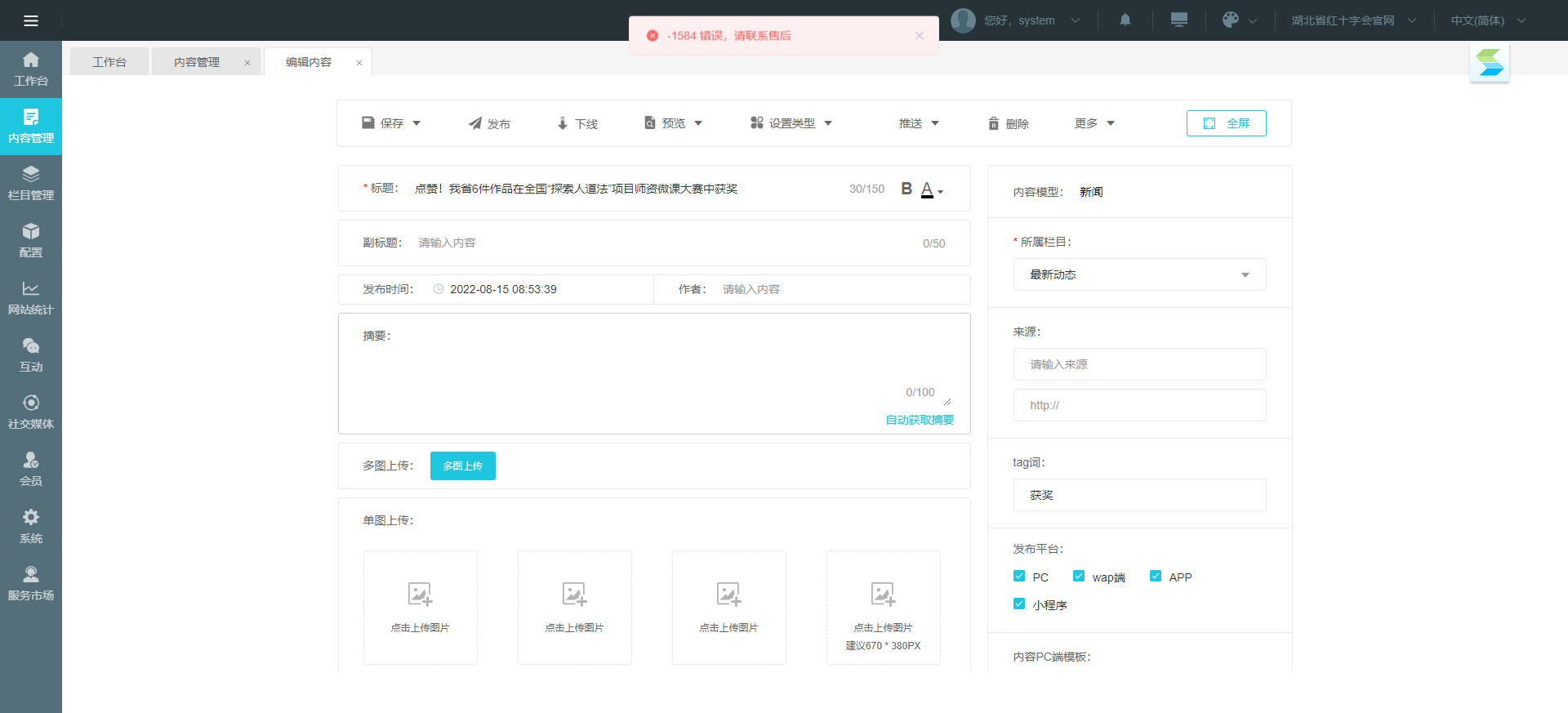 部署到内网环境后,点击内容管理中的任意内容后进入报错如下 查看后台日志  后台日志报错如下  为啥?