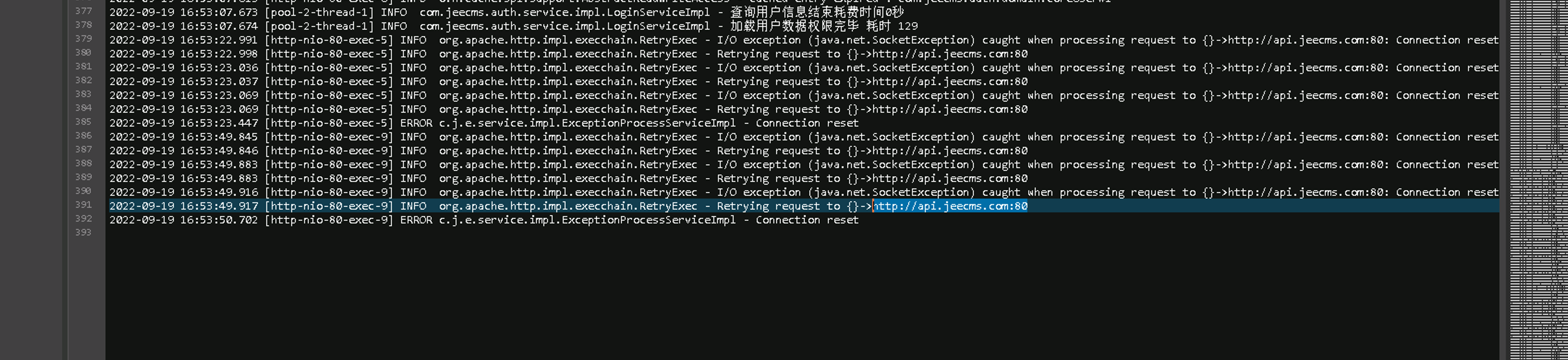 后台日志打印一直在尝试请求一个api.jeecms.com的域名的接口 导致报错