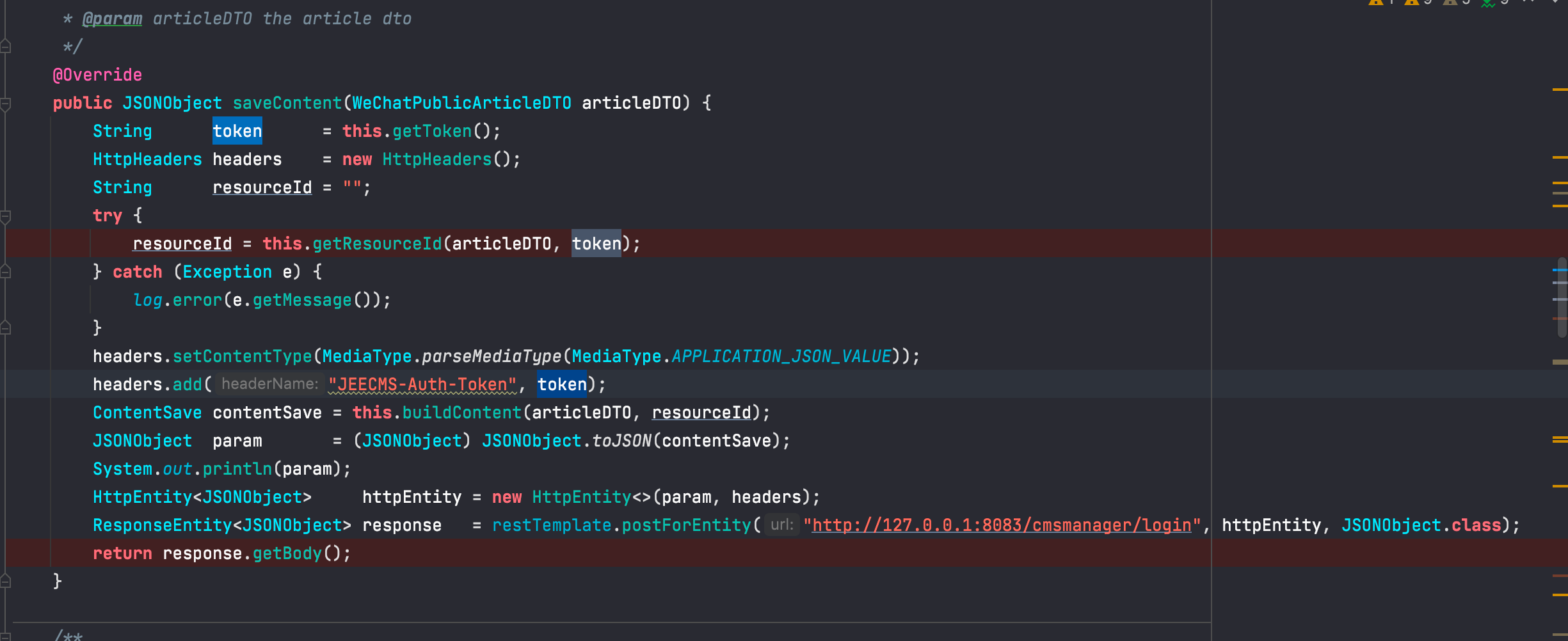 String token = this.getToken(); HttpHeaders headers = new HttpHeaders(); String resourceId = ""; try { resourceId = this.getResourceId(articleDTO, token); } catch (Exception e) { log.error(e.getMessage()); } headers.setContentType(MediaType.parseMediaType(MediaType.APPLICATION_JSON_VALUE)); headers.add("JEECMS-Auth-Token", token); ContentSave contentSave = this.buildContent(articleDTO, resourceId); JSONObject param = (JSONObject) JSONObject.toJSON(contentSave); System.out.println(param); HttpEntity<JSONObject> httpEntity = new HttpEntity<>(param, headers); ResponseEntity<JSONObject> response = restTemplate.postForEntity("http://127.0.0.1:8083/cmsmanager/login", httpEntity, JSONObject.class); return response.getBody(); } private String getToken() { MultiValueMap<String, Object> map = new LinkedMultiValueMap<>(); map.add("identity", "system"); map.add("desStr", "EwSSctvjsSzm8sZN2B5mecOcSAGZeGEZ"); MediaType mediaType = MediaType.parseMediaType(MediaType.MULTIPART_FORM_DATA_VALUE); HttpHeaders headers = new HttpHeaders(); headers.setContentType(mediaType); HttpEntity<MultiValueMap<String, Object>> multiValueMapHttpEntity = new HttpEntity<>(map, headers); ResponseEntity<JSONObject> jsonObjectResponseEntity = restTemplate.postForEntity("localhost:8083/cmsmanager/login", multiValueMapHttpEntity, JSONObject.class); JSONObject body = jsonObjectResponseEntity.getBody(); JSONObject data = body.getJSONObject("data"); String string = data.getString("JEECMS-Auth-Token"); return string; } |
