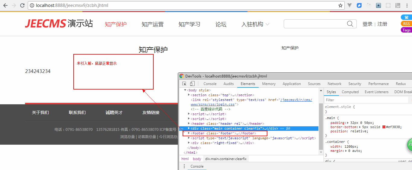 你好,是这个意思,底部没了。 使用开发者工具观察,footer元素也不存在了。 |