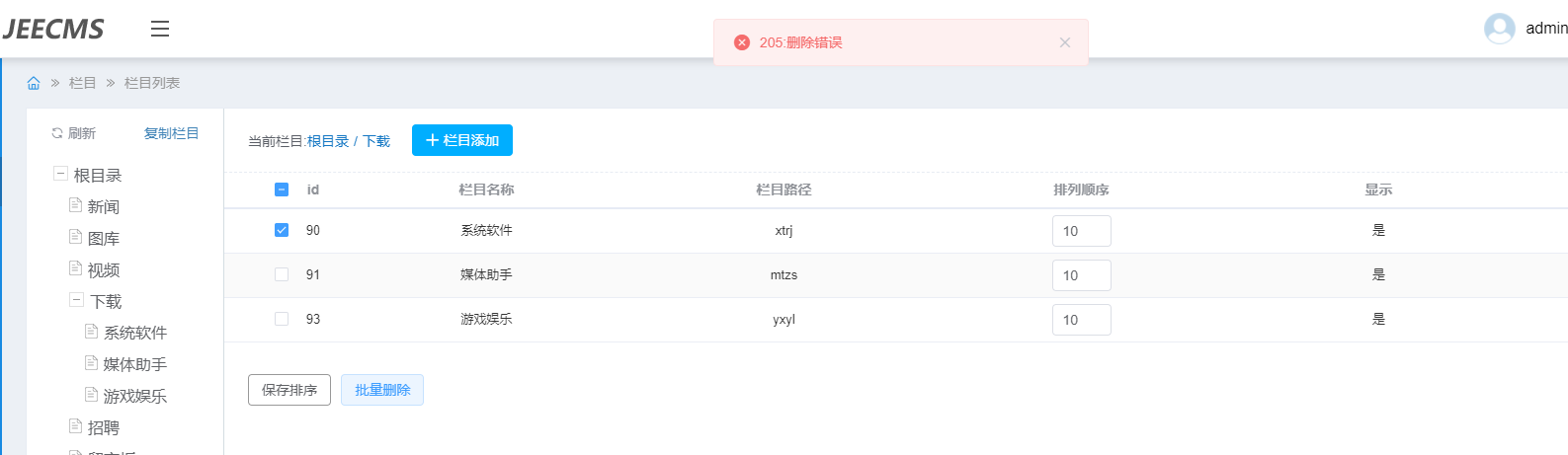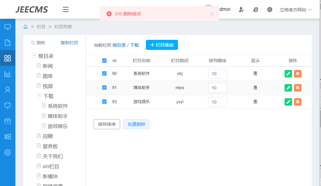 您好,,比如说我想删除“下载”栏目,我在后台删除失败。。 ![]() |