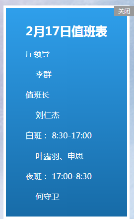您好 这个功能是可以实现的 您可以先创建一个值班信息的栏目 然后 在这个栏目中发布内容 最后在您的index.html也就是首页的模板中写上获取这个栏目的信息的前台模板代码就可以实现您这个效果了