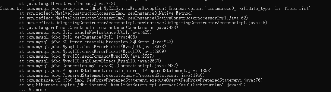 回复第66楼Caused by: com.mysql.jdbc.exceptions.jdbc4.MySQLSyntaxErrorException: Unknown column 'cmssmsreco0_.validate_type' in 'field list'