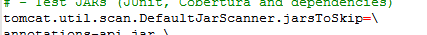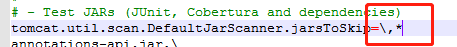 ———————————————————— 找到 tomcat.util.scan.DefaultJarScanner.jarsToSkip=\ ![]() 在后面加 ,* ![]() |