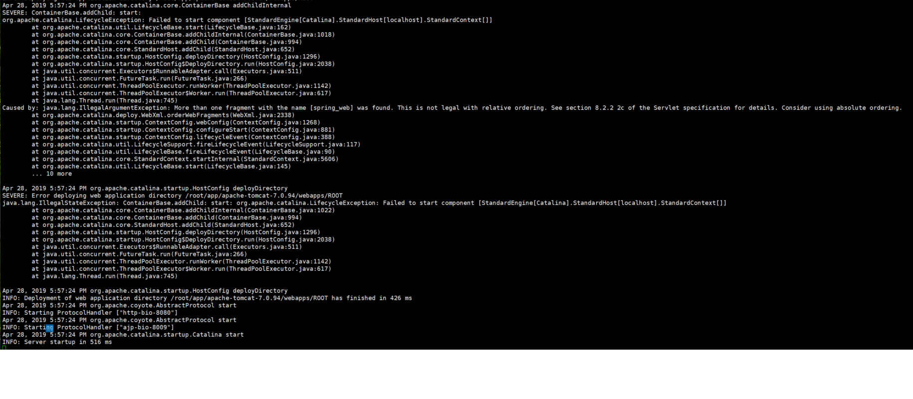 INFO: Starting Servlet Engine: Apache Tomcat/7.0.94 Apr 29, 2019 3:40:51 PM org.apache.catalina.startup.HostConfig deployDirectory INFO: Deploying web application directory /root/app/apache-tomcat-7.0.94/webapps/ROOT Apr 29, 2019 3:40:51 PM org.apache.catalina.core.ContainerBase addChildInternal SEVERE: ContainerBase.addChild: start: org.apache.catalina.LifecycleException: Failed to start component [StandardEngine[Catalina].StandardHost[localhost].StandardContext[]] at org.apache.catalina.util.LifecycleBase.start(LifecycleBase.java:162) at org.apache.catalina.core.ContainerBase.addChildInternal(ContainerBase.java:1018) at org.apache.catalina.core.ContainerBase.addChild(ContainerBase.java:994) at org.apache.catalina.core.StandardHost.addChild(StandardHost.java:652) at org.apache.catalina.startup.HostConfig.deployDirectory(HostConfig.java:1296) at org.apache.catalina.startup.HostConfig$DeployDirectory.run(HostConfig.java:2038) at java.util.concurrent.Executors$RunnableAdapter.call(Executors.java:511) at java.util.concurrent.FutureTask.run(FutureTask.java:266) at java.util.concurrent.ThreadPoolExecutor.runWorker(ThreadPoolExecutor.java:1142) at java.util.concurrent.ThreadPoolExecutor$Worker.run(ThreadPoolExecutor.java:617) at java.lang.Thread.run(Thread.java:745) Caused by: java.lang.IllegalArgumentException: More than one fragment with the name [spring_web] was found. This is not legal with relative ordering. See section 8.2.2 2c of the Servlet specification for details. Consider using absolute ordering. at org.apache.catalina.deploy.WebXml.orderWebFragments(WebXml.java:2338) at org.apache.catalina.startup.ContextConfig.webConfig(ContextConfig.java:1268) at org.apache.catalina.startup.ContextConfig.configureStart(ContextConfig.java:881) at org.apache.catalina.startup.ContextConfig.lifecycleEvent(ContextConfig.java:388) at org.apache.catalina.util.LifecycleSupport.fireLifecycleEvent(LifecycleSupport.java:117) at org.apache.catalina.util.LifecycleBase.fireLifecycleEvent(LifecycleBase.java:90) at org.apache.catalina.core.StandardContext.startInternal(StandardContext.java:5606) at org.apache.catalina.util.LifecycleBase.start(LifecycleBase.java:145) ... 10 more Apr 29, 2019 3:40:51 PM org.apache.catalina.startup.HostConfig deployDirectory SEVERE: Error deploying web application directory /root/app/apache-tomcat-7.0.94/webapps/ROOT java.lang.IllegalStateException: ContainerBase.addChild: start: org.apache.catalina.LifecycleException: Failed to start component [StandardEngine[Catalina].StandardHost[localhost].StandardContext[]] at org.apache.catalina.core.ContainerBase.addChildInternal(ContainerBase.java:1022) at org.apache.catalina.core.ContainerBase.addChild(ContainerBase.java:994) at org.apache.catalina.core.StandardHost.addChild(StandardHost.java:652) at org.apache.catalina.startup.HostConfig.deployDirectory(HostConfig.java:1296) at org.apache.catalina.startup.HostConfig$DeployDirectory.run(HostConfig.java:2038) at java.util.concurrent.Executors$RunnableAdapter.call(Executors.java:511) at java.util.concurrent.FutureTask.run(FutureTask.java:266) at java.util.concurrent.ThreadPoolExecutor.runWorker(ThreadPoolExecutor.java:1142) at java.util.concurrent.ThreadPoolExecutor$Worker.run(ThreadPoolExecutor.java:617) at java.lang.Thread.run(Thread.java:745) Apr 29, 2019 3:40:51 PM org.apache.catalina.startup.HostConfig deployDirectory INFO: Deployment of web application directory /root/app/apache-tomcat-7.0.94/webapps/ROOT has finished in 495 ms Apr 29, 2019 3:40:51 PM org.apache.coyote.AbstractProtocol start INFO: Starting ProtocolHandler ["http-bio-8080"] Apr 29, 2019 3:40:51 PM org.apache.coyote.AbstractProtocol start INFO: Starting ProtocolHandler ["ajp-bio-8009"] Apr 29, 2019 3:40:52 PM org.apache.catalina.startup.Catalina start INFO: Server startup in 568 ms |