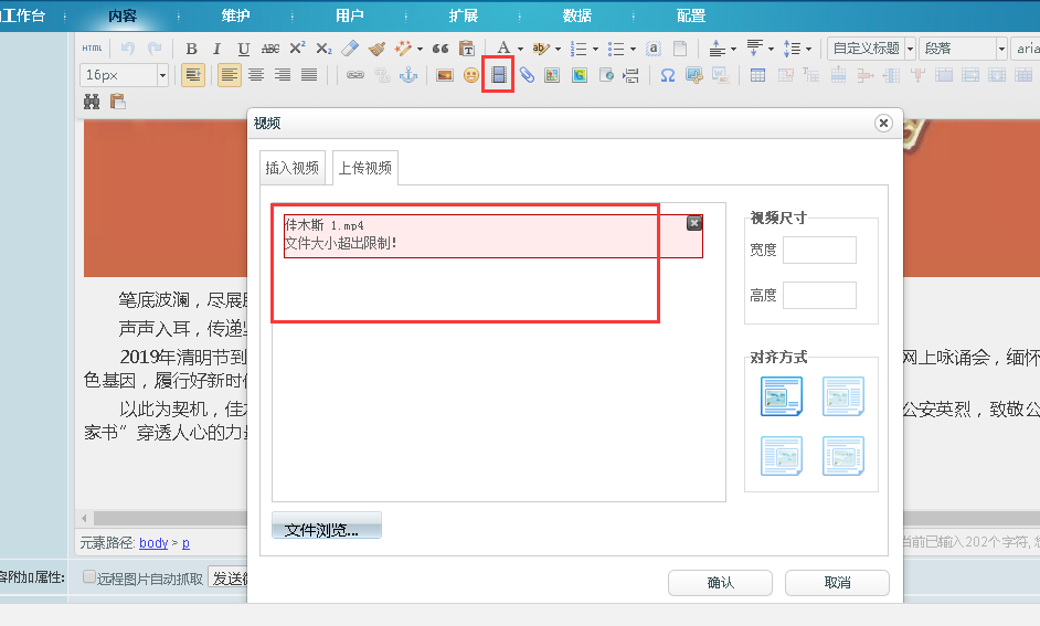 主题 : 内容发布,通过富文本框上传的视频大小在哪里设置 |