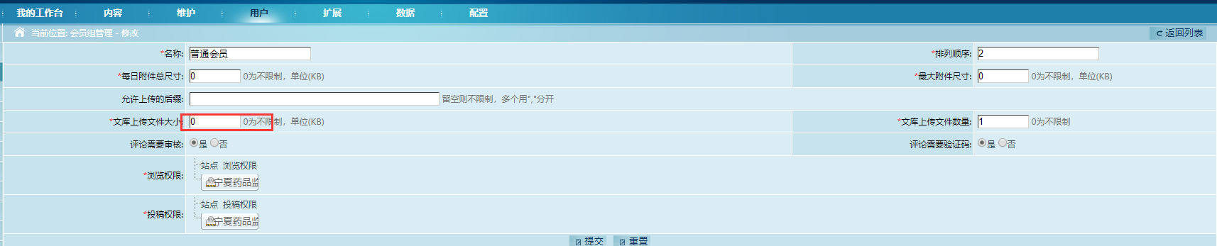 您那边可以升级下系统吗? 我们这边对v7版本已经不再维护了 并且目前我们的上传文件的大小就是通过会员组这里限制的