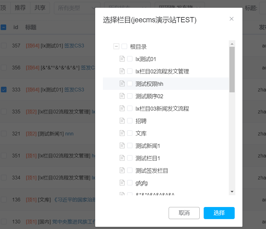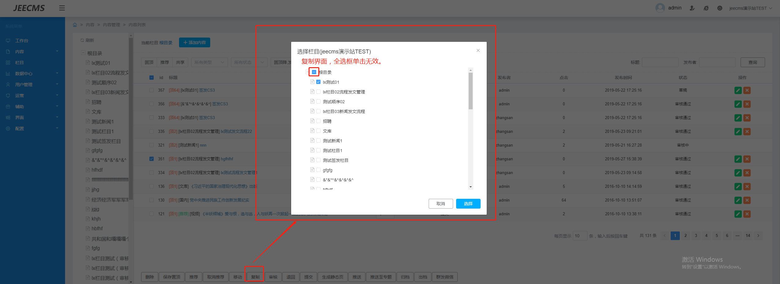 您好 您上面说的哪个问题我和开发那边说了下 这个是这样的 如果我们把这个按钮色值为全选后由于栏目内字段的问题是无法使用的 所以我们做成了这样 这个是没法改的 您只能选您对应要复制到的栏目进行复制 然后您后面的这个问题 应该是个bug我先和我们开发反馈下