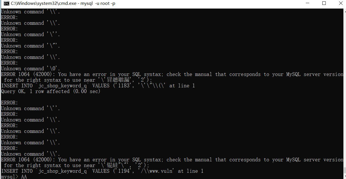 ERROR 1366 (HY000): Incorrect string value: '\xA7\x84\xE8\x8C\x83\xE5...' for column 'keyword' at row 1 ERROR 1366 (HY000): Incorrect string value: '\xAE\xE9\x9E\x8B' for column 'keyword' at row 1 Query OK, 1 row affected (0.00 sec) Query OK, 1 row affected (0.01 sec) ERROR 1406 (22001): Data too long for column 'keyword' at row 1 ERROR 1366 (HY000): Incorrect string value: '\xA6\x82' for column 'keyword' at row 1 Query OK, 1 row affected (0.00 sec) Query OK, 1 row affected (0.01 sec) Query OK, 1 row affected (0.00 sec) Query OK, 1 row affected (0.00 sec) Query OK, 1 row affected (0.01 sec) ERROR 1406 (22001): Data too long for column 'keyword' at row 1 ERROR 1406 (22001): Data too long for column 'keyword' at row 1 ERROR 1406 (22001): Data too long for column 'keyword' at row 1 ERROR 1366 (HY000): Incorrect string value: '\xA7\x92\xE8\xB4\xA8' for column 'keyword' at row 1 Query OK, 1 row affected (0.01 sec) Query OK, 1 row affected (0.00 sec) ERROR 1366 (HY000): Incorrect string value: '\xAF\xB9\xE5\xAF\xB9' for column 'keyword' at row 1 ERROR 1406 (22001): Data too long for column 'keyword' at row 1 Query OK, 1 row affected (0.01 sec) Query OK, 1 row affected (0.00 sec) Query OK, 1 row affected (0.00 sec) Query OK, 1 row affected (0.00 sec) ERROR 1406 (22001): Data too long for column 'keyword' at row 1 Query OK, 1 row affected (0.01 sec) ERROR 1406 (22001): Data too long for column 'keyword' at row 1 Query OK, 1 row affected (0.00 sec) ERROR 1406 (22001): Data too long for column 'keyword' at row 1 Query OK, 1 row affected (0.01 sec) ERROR 1366 (HY000): Incorrect string value: '\xAD\xA3' for column 'keyword' at row 1 Query OK, 1 row affected (0.00 sec) Query OK, 1 row affected (0.01 sec) Query OK, 1 row affected (0.00 sec) Query OK, 1 row affected (0.01 sec) Query OK, 1 row affected (0.00 sec) Query OK, 1 row affected (0.01 sec) Query OK, 1 row affected (0.00 sec) Query OK, 1 row affected (0.01 sec) Query OK, 1 row affected (0.00 sec) Query OK, 1 row affected (0.01 sec) Query OK, 1 row affected (0.00 sec) ERROR 1366 (HY000): Incorrect string value: '\x98 resp...' for column 'keyword' at row 1 ERROR 1366 (HY000): Incorrect string value: '\x9C resp...' for column 'keyword' at row 1 Query OK, 1 row affected (0.00 sec) Query OK, 1 row affected (0.00 sec) Query OK, 1 row affected (0.00 sec) Query OK, 1 row affected (0.00 sec) Query OK, 1 row affected (0.00 sec) Query OK, 1 row affected (0.00 sec) Query OK, 1 row affected (0.00 sec) ERROR 1366 (HY000): Incorrect string value: '\x98; wai...' for column 'keyword' at row 1 ERROR 1366 (HY000): Incorrect string value: '\x98;sele...' for column 'keyword' at row 1 Query OK, 1 row affected (0.01 sec) Query OK, 1 row affected (0.00 sec) Query OK, 1 row affected (0.00 sec) Query OK, 1 row affected (0.01 sec) ERROR 1366 (HY000): Incorrect string value: '\x98 resp...' for column 'keyword' at row 1 Query OK, 1 row affected (0.00 sec) Query OK, 1 row affected (0.01 sec) ERROR 1366 (HY000): Incorrect string value: '\x9C resp...' for column 'keyword' at row 1 Query OK, 1 row affected (0.00 sec) Query OK, 1 row affected (0.01 sec) ERROR 1366 (HY000): Incorrect string value: '\x98; wai...' for column 'keyword' at row 1 ERROR 1366 (HY000): Incorrect string value: '\x98;sele...' for column 'keyword' at row 1 Query OK, 1 row affected (0.00 sec) Query OK, 1 row affected (0.01 sec) Query OK, 1 row affected (0.00 sec) Query OK, 1 row affected (0.00 sec) Query OK, 1 row affected (0.00 sec) Query OK, 1 row affected (0.00 sec) Query OK, 1 row affected (0.00 sec) Query OK, 1 row affected (0.00 sec) Query OK, 1 row affected (0.01 sec) Query OK, 1 row affected (0.00 sec) Query OK, 1 row affected (0.00 sec) ERROR: Unknown command '\''. ERROR: Unknown command '\''. ERROR: Unknown command '\"'. ERROR: Unknown command '\\'. ERROR: Unknown command '\\'. ERROR: Unknown command '\\'. ERROR: Unknown command '\\'. ERROR: Unknown command '\''. ERROR: Unknown command '\"'. ERROR: Unknown command '\\'. ERROR: Unknown command '\0'. ERROR 1064 (42000): You have an error in your SQL syntax; check the manual that corresponds to your MySQL server version for the right syntax to use near '\'冒聼聮漏', '2'); INSERT INTO `jc_shop_keyword_q` VALUES ('1183', '\'\"\\(\' at line 1 Query OK, 1 row affected (0.00 sec) ERROR: Unknown command '\''. ERROR: Unknown command '\\'. ERROR: Unknown command '\\'. ERROR: Unknown command '\\'. ERROR: Unknown command '\\'. ERROR 1064 (42000): You have an error in your SQL syntax; check the manual that corresponds to your MySQL server version for the right syntax to use near '\'锟絓"\"', '2'); INSERT INTO `jc_shop_keyword_q` VALUES ('1194', '/\\www.vuln' at line 1 |