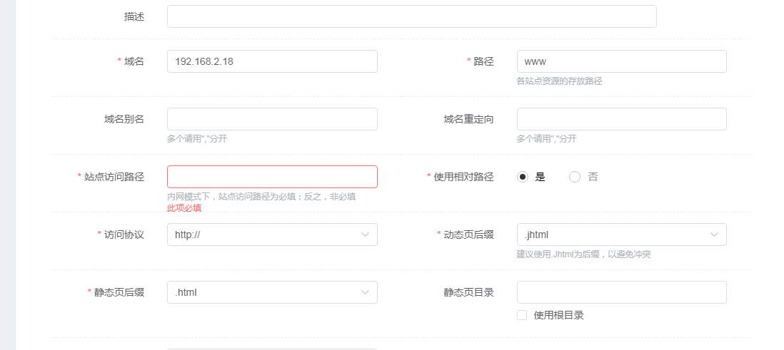 这个是在内网模式下的内容 您开启了内网模式后需要给您的站点加上一个分辨的访问方式 比如在这加上zz后 您前台访问的时候就需要在访问的地址后再加上/zz