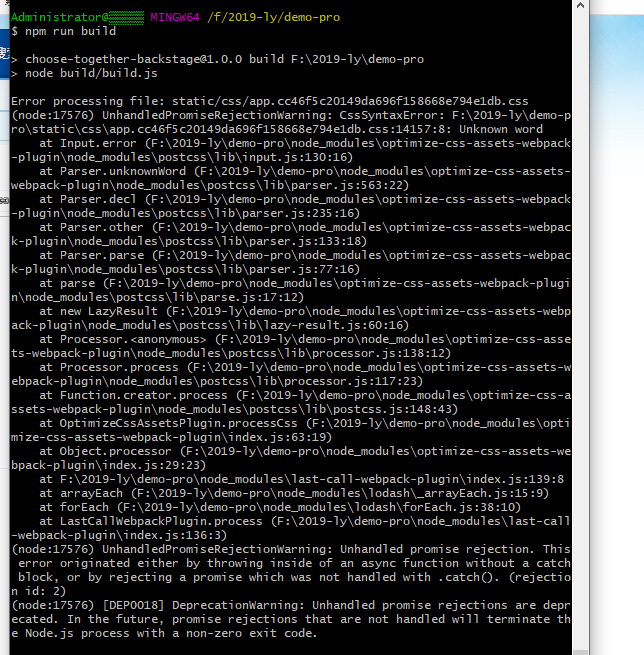 > choose-together-backstage@1.0.0 build F:\2019-ly\demo-pro > node build/build.js Error processing file: static/css/app.cc46f5c20149da696f158668e794e1db.css (node:17576) UnhandledPromiseRejectionWarning: CssSyntaxError: F:\2019-ly\demo-pro\static\css\app.cc46f5c20149da696f158668e794e1db.css:14157:8: Unknown word at Input.error (F:\2019-ly\demo-pro\node_modules\optimize-css-assets-webpack-plugin\node_modules\postcss\lib\input.js:130:16) at Parser.unknownWord (F:\2019-ly\demo-pro\node_modules\optimize-css-assets-webpack-plugin\node_modules\postcss\lib\parser.js:563:22) at Parser.decl (F:\2019-ly\demo-pro\node_modules\optimize-css-assets-webpack-plugin\node_modules\postcss\lib\parser.js:235:16) at Parser.other (F:\2019-ly\demo-pro\node_modules\optimize-css-assets-webpack-plugin\node_modules\postcss\lib\parser.js:133:18) at Parser.parse (F:\2019-ly\demo-pro\node_modules\optimize-css-assets-webpack-plugin\node_modules\postcss\lib\parser.js:77:16) at parse (F:\2019-ly\demo-pro\node_modules\optimize-css-assets-webpack-plugin\node_modules\postcss\lib\parse.js:17:12) at new LazyResult (F:\2019-ly\demo-pro\node_modules\optimize-css-assets-webpack-plugin\node_modules\postcss\lib\lazy-result.js:60:16) at Processor.<anonymous> (F:\2019-ly\demo-pro\node_modules\optimize-css-assets-webpack-plugin\node_modules\postcss\lib\processor.js:138:12) at Processor.process (F:\2019-ly\demo-pro\node_modules\optimize-css-assets-webpack-plugin\node_modules\postcss\lib\processor.js:117:23) at Function.creator.process (F:\2019-ly\demo-pro\node_modules\optimize-css-assets-webpack-plugin\node_modules\postcss\lib\postcss.js:148:43) at OptimizeCssAssetsPlugin.processCss (F:\2019-ly\demo-pro\node_modules\optimize-css-assets-webpack-plugin\index.js:63:19) at Object.processor (F:\2019-ly\demo-pro\node_modules\optimize-css-assets-webpack-plugin\index.js:29:23) at F:\2019-ly\demo-pro\node_modules\last-call-webpack-plugin\index.js:139:8 at arrayEach (F:\2019-ly\demo-pro\node_modules\lodash\_arrayEach.js:15:9) at forEach (F:\2019-ly\demo-pro\node_modules\lodash\forEach.js:38:10) at LastCallWebpackPlugin.process (F:\2019-ly\demo-pro\node_modules\last-call-webpack-plugin\index.js:136:3) (node:17576) UnhandledPromiseRejectionWarning: Unhandled promise rejection. This error originated either by throwing inside of an async function without a catch block, or by rejecting a promise which was not handled with .catch(). (rejection id: 2) (node:17576) [DEP0018] DeprecationWarning: Unhandled promise rejections are deprecated. In the future, promise rejections that are not handled will terminate the Node.js process with a non-zero exit code. |