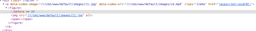首页模板,模板是正确的 ![]() <div class="trailer"> <a data-video-image="images/11.jpg" data-video-url="images/zz.mp4" class="items" href="javascript:void(0);"> <figure> <img src="images/11.jpg" alt=""><span></span> </figure> </a> </div> |