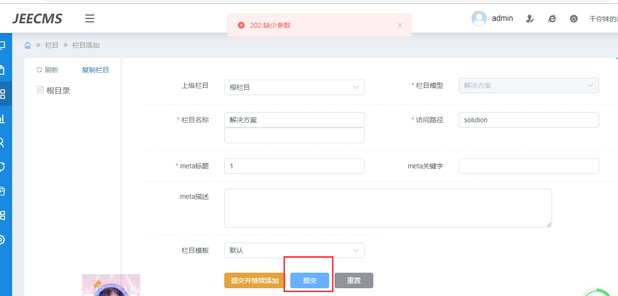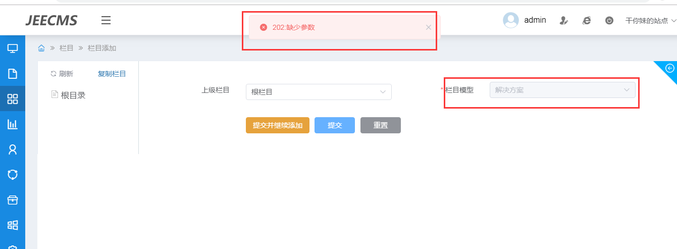 然后在栏目中添加对应的栏目,报错了。这是什么原因呢?