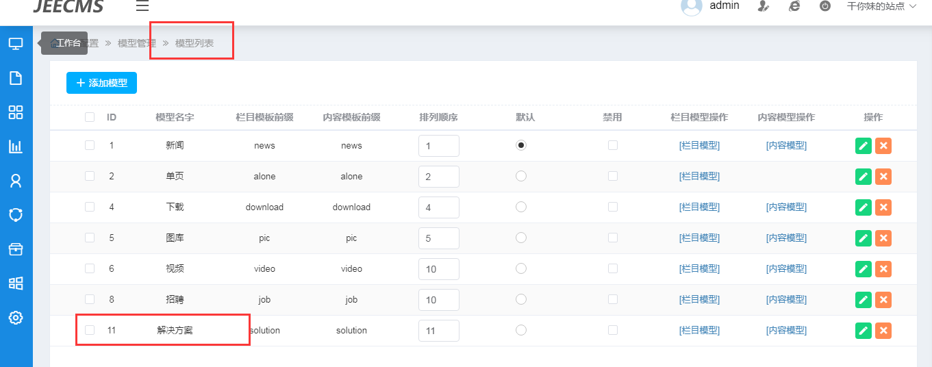 添加栏目流程,我首先在配置--》模型管理下添加模型“”解决方案“”,
