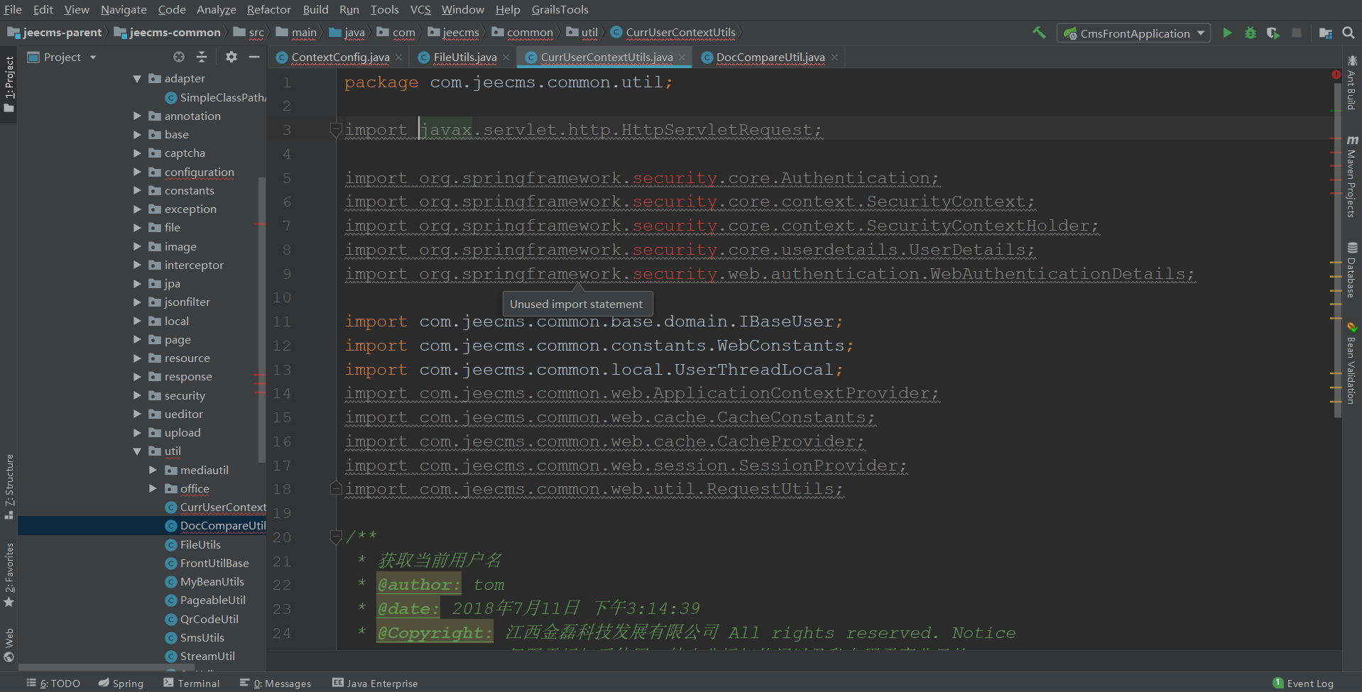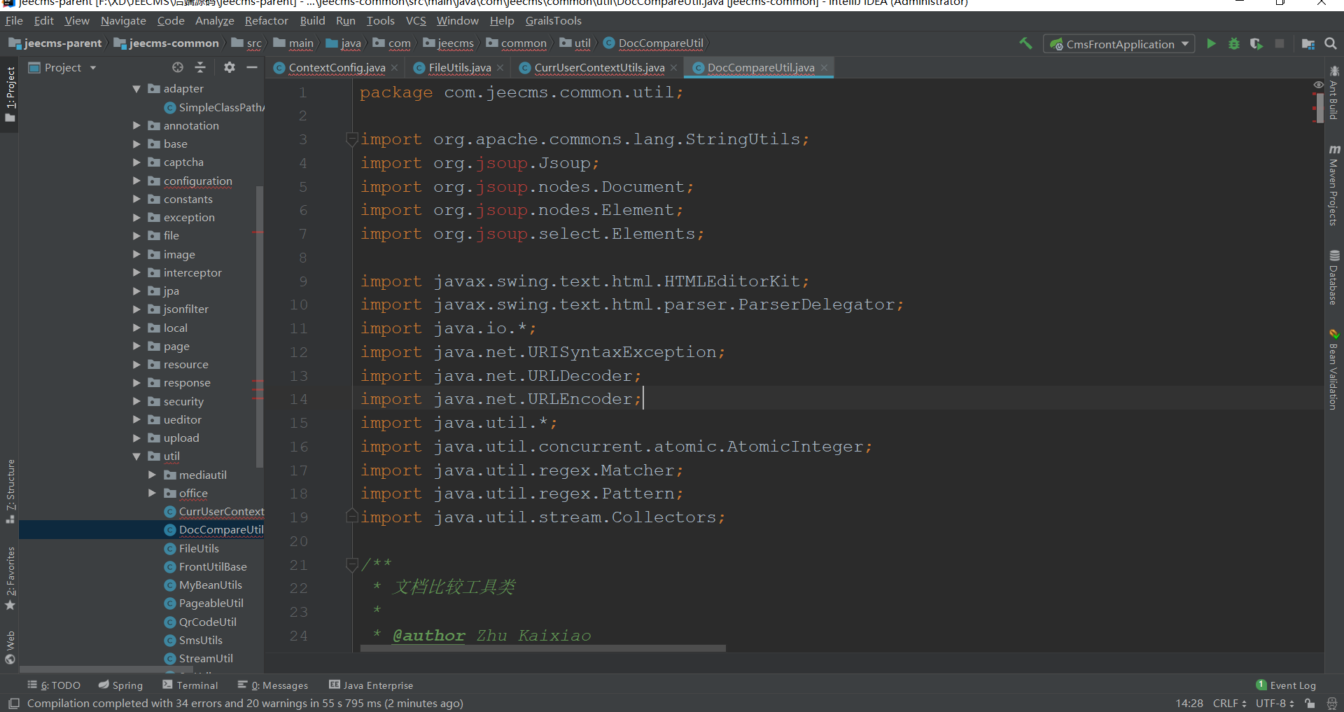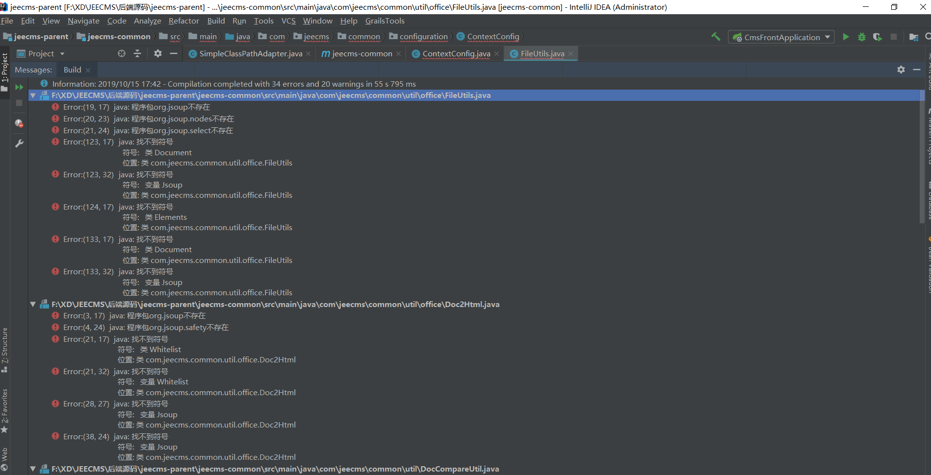 Error:(11, 30) java: 找不到符号 符号: 类 PropertiesUtil 位置: 程序包 com.jeecms.common.util Error:(24, 49) java: 程序包org.springframework.security.core.session不存在 Error:(5, 30) java: 找不到符号 符号: 类 Encodes 位置: 程序包 com.jeecms.common.util Error:(5, 23) java: 程序包org.jsoup.nodes不存在 特别多 |