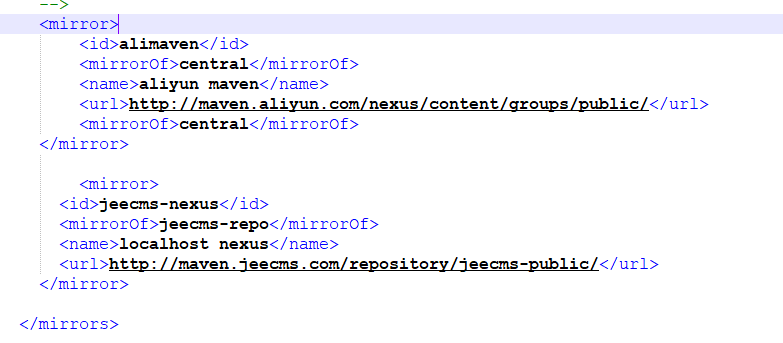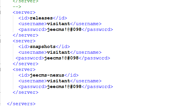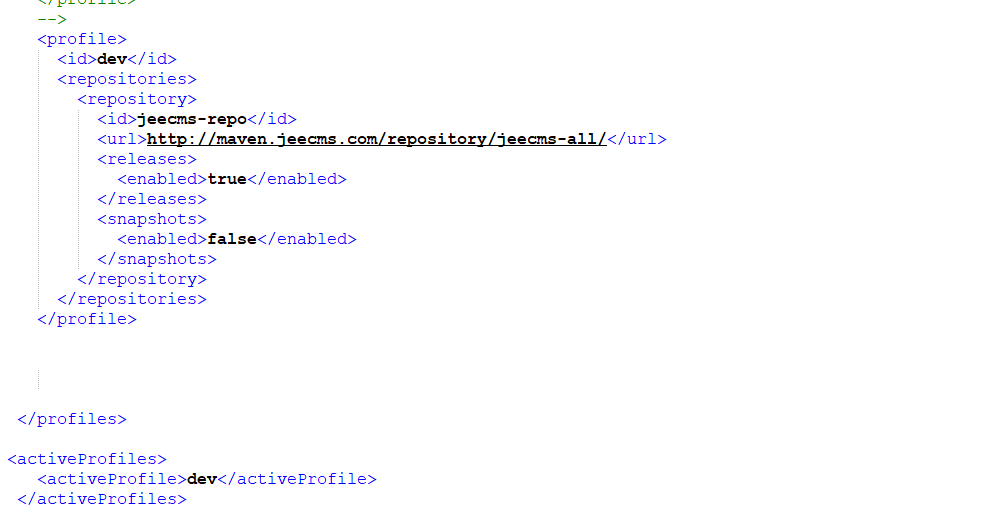 <settings xmlns="http://maven.apache.org/SETTINGS/1.0.0" xmlns:xsi="http://www.w3.org/2001/XMLSchema-instance" xsi:schemaLocation="http://maven.apache.org/SETTINGS/1.0.0 http://maven.apache.org/xsd/settings-1.0.0.xsd"> <localRepository>D:\repository</localRepository> <server> <id>releases</id> <username>visitant</username> <password>jeecms!@#098</password> </server> <server> <id>snapshots</id> <username>visitant</username> <password>jeecms!@#098</password> </server> <server> <id>jeecms-nexus</id> <username>visitant</username> <password>jeecms!@#098</password> </server> </servers> <mirrors> <mirror> <id>alimaven</id> <mirrorOf>central</mirrorOf> <name>aliyun maven</name> <url>http://maven.aliyun.com/nexus/content/groups/public/</url> <mirrorOf>central</mirrorOf> </mirror> <mirror> <id>jeecms-nexus</id> <mirrorOf>jeecms-repo</mirrorOf> <name>localhost nexus</name> <url>http://maven.jeecms.com/repository/jeecms-public/</url> </mirror> </mirrors> <profiles> <profile> <id>dev</id> <repositories> <repository> <id>jeecms-repo</id> <url>http://maven.jeecms.com/repository/jeecms-all/</url> <releases> <enabled>true</enabled> </releases> <snapshots> <enabled>false</enabled> </snapshots> </repository> </repositories> </profile> </profiles> <activeProfiles> <activeProfile>dev</activeProfile> </activeProfiles> </settings> |