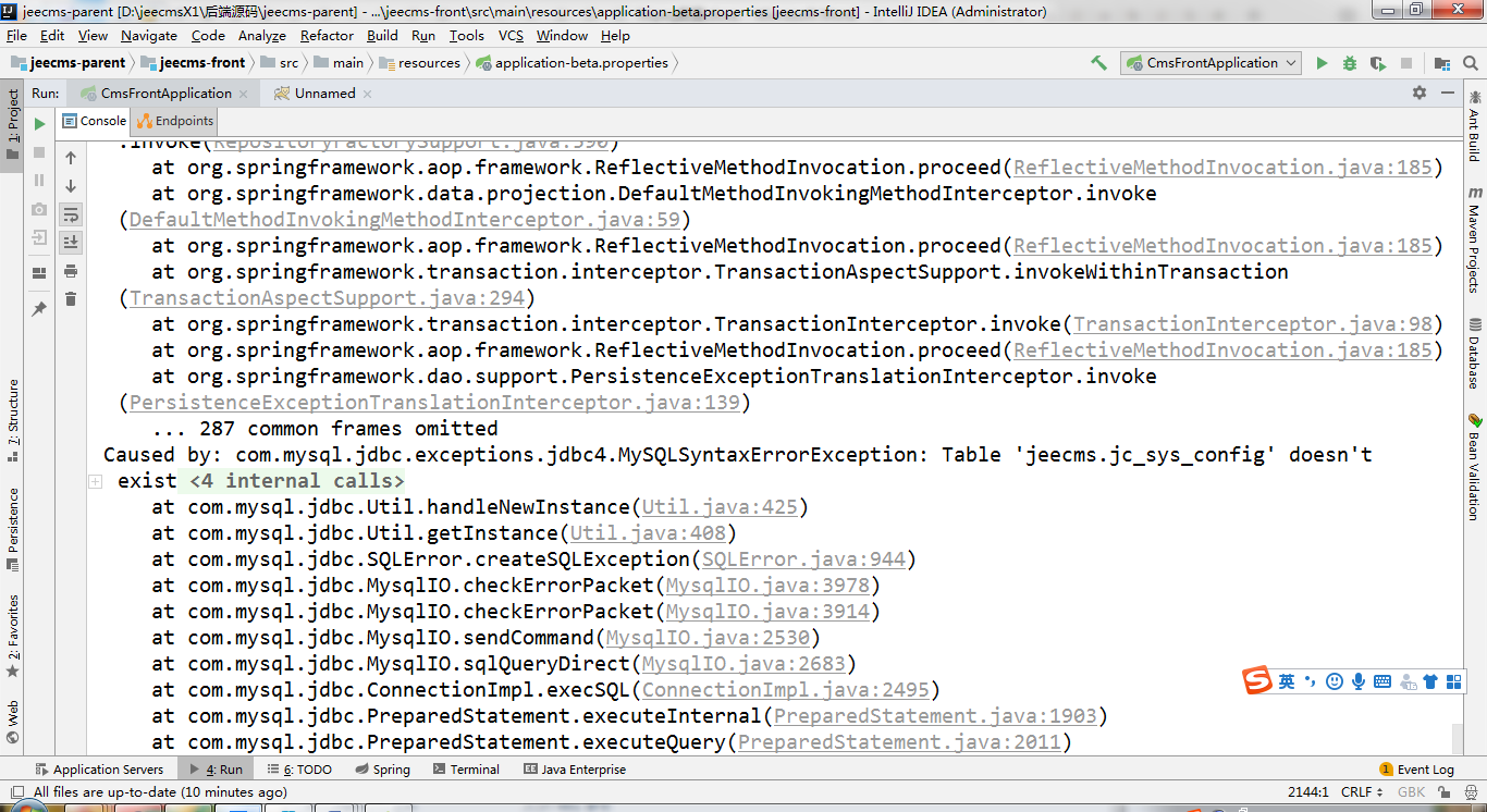 现在是不报错了,那接下来在那个在JEECMS系统安装部署完毕后,访问网址一直不对是什么原因呢? ![]() 数据库确实是已经运行了的,而且运行的那个.sql文件后,确实是没有jeecms.jc_sys_config这个表 |