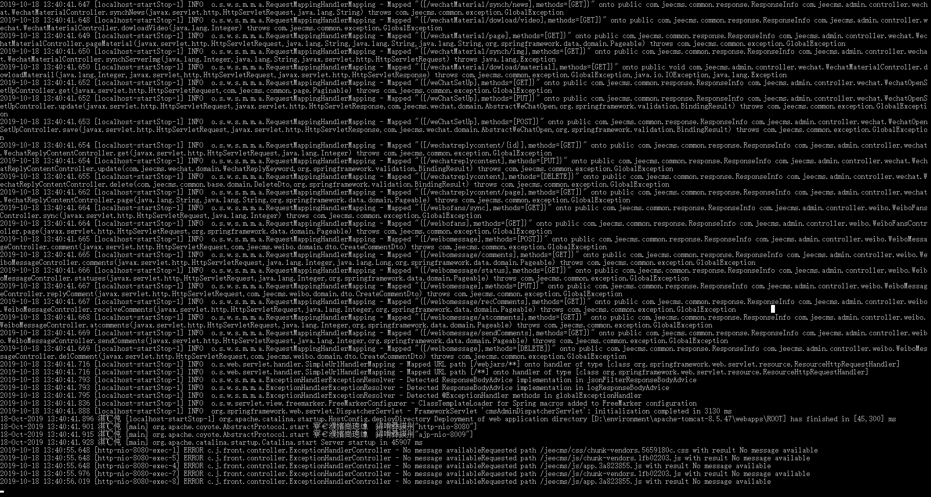 2019-10-18 13:51:39.353 [http-nio-8080-exec-4] ERROR c.j.front.controller.ExceptionHandlerController - No message availableRequested path /jeecms/js/chunk-vendors.1fb02203.js with result No message available 2019-10-18 13:51:39.353 [http-nio-8080-exec-5] ERROR c.j.front.controller.ExceptionHandlerController - No message availableRequested path /jeecms/js/app.3a8238*js with result No message available 貌似项目部署包缺少文件! |