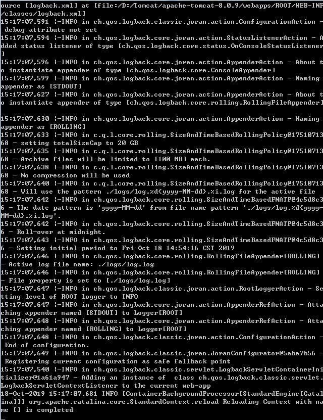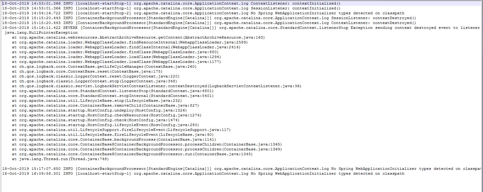 18-Oct-2019 14:53:01.366 INFO [localhost-startStop-1] org.apache.catalina.core.ApplicationContext.log ContextListener: contextInitialized() 18-Oct-2019 14:53:01.366 INFO [localhost-startStop-1] org.apache.catalina.core.ApplicationContext.log SessionListener: contextInitialized() 18-Oct-2019 14:54:16.722 INFO [localhost-startStop-2] org.apache.catalina.core.ApplicationContext.log No Spring WebApplicationInitializer types detected on classpath 18-Oct-2019 15:15:20.443 INFO [ContainerBackgroundProcessor[StandardEngine[Catalina]]] org.apache.catalina.core.ApplicationContext.log SessionListener: contextDestroyed() 18-Oct-2019 15:15:20.443 INFO [ContainerBackgroundProcessor[StandardEngine[Catalina]]] org.apache.catalina.core.ApplicationContext.log ContextListener: contextDestroyed() 18-Oct-2019 15:16:11.422 SEVERE [ContainerBackgroundProcessor[StandardEngine[Catalina]]] org.apache.catalina.core.StandardContext.listenerStop Exception sending context destroyed event to listener instance of class ch.qos.logback.classic.servlet.LogbackServletContextListener java.lang.NullPointerException at org.apache.catalina.webresources.AbstractArchiveResource.getContent(AbstractArchiveResource.java:163) at org.apache.catalina.loader.WebappClassLoader.findResourceInternal(WebappClassLoader.java:2589) at org.apache.catalina.loader.WebappClassLoader.findClassInternal(WebappClassLoader.java:2414) at org.apache.catalina.loader.WebappClassLoader.findClass(WebappClassLoader.java:880) at org.apache.catalina.loader.WebappClassLoader.loadClass(WebappClassLoader.java:1294) at org.apache.catalina.loader.WebappClassLoader.loadClass(WebappClassLoader.java:1177) at ch.qos.logback.core.ContextBase.getLifeCycleManager(ContextBase.java:260) at ch.qos.logback.core.ContextBase.reset(ContextBase.java:175) at ch.qos.logback.classic.LoggerContext.reset(LoggerContext.java:220) at ch.qos.logback.classic.LoggerContext.stop(LoggerContext.java:348) at ch.qos.logback.classic.servlet.LogbackServletContextListener.contextDestroyed(LogbackServletContextListener.java:36) at org.apache.catalina.core.StandardContext.listenerStop(StandardContext.java:4801) at org.apache.catalina.core.StandardContext.stopInternal(StandardContext.java:5401) at org.apache.catalina.util.LifecycleBase.stop(LifecycleBase.java:232) at org.apache.catalina.core.ContainerBase.removeChild(ContainerBase.java:827) at org.apache.catalina.startup.HostConfig.undeploy(HostConfig.java:1326) at org.apache.catalina.startup.HostConfig.checkResources(HostConfig.java:1274) at org.apache.catalina.startup.HostConfig.check(HostConfig.java:1474) at org.apache.catalina.startup.HostConfig.lifecycleEvent(HostConfig.java:280) at org.apache.catalina.util.LifecycleSupport.fireLifecycleEvent(LifecycleSupport.java:117) at org.apache.catalina.util.LifecycleBase.fireLifecycleEvent(LifecycleBase.java:90) at org.apache.catalina.core.ContainerBase.backgroundProcess(ContainerBase.java:1141) at org.apache.catalina.core.ContainerBase$ContainerBackgroundProcessor.processChildren(ContainerBase.java:1365) at org.apache.catalina.core.ContainerBase$ContainerBackgroundProcessor.processChildren(ContainerBase.java:1369) at org.apache.catalina.core.ContainerBase$ContainerBackgroundProcessor.run(ContainerBase.java:1345) at java.lang.Thread.run(Thread.java:748) 18-Oct-2019 15:17:07.650 INFO [ContainerBackgroundProcessor[StandardEngine[Catalina]]] org.apache.catalina.core.ApplicationContext.log No Spring WebApplicationInitializer types detected on classpath 18-Oct-2019 16:09:58.301 INFO [localhost-startStop-1] org.apache.catalina.core.ApplicationContext.log No Spring WebApplicationInitializer types detected on classpath |
