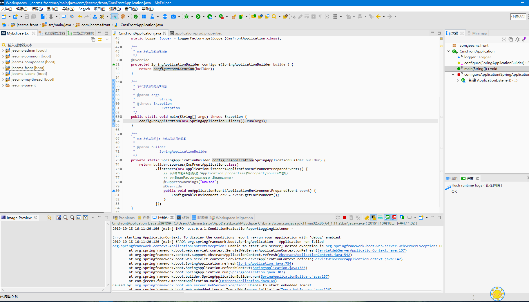 开始用部署包丢进tomcat8.5下运行,就报org.springframework.beans.factory.BeanCreationException Error creating bean 之类的,运行不了,就下了源码包按照教程导入maven,项目看起来都正常了,运行CmsFrontApplication还是报差不多的错