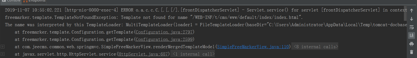 The name was interpreted by this TemplateLoader: MultiTemplateLoader(loader1 = FileTemplateLoader(baseDir="C:\Users\Administrator\AppData\Local\Temp\tomcat-docbase.8413942305673480039.8080", canonicalBasePath="C:\Users\Administrator\AppData\Local\Temp\tomcat-docbase.8413942305673480039.8080\"), loader2 = ClassTemplateLoader(resourceLoaderClass=org.springframework.web.servlet.view.freemarker.FreeMarkerConfigurer, basePackagePath="" /* relatively to resourceLoaderClass pkg */)). and trace freemarker.template.TemplateNotFoundException: Template not found for name "/WEB-INF/t/cms/www/default/index/index.html".