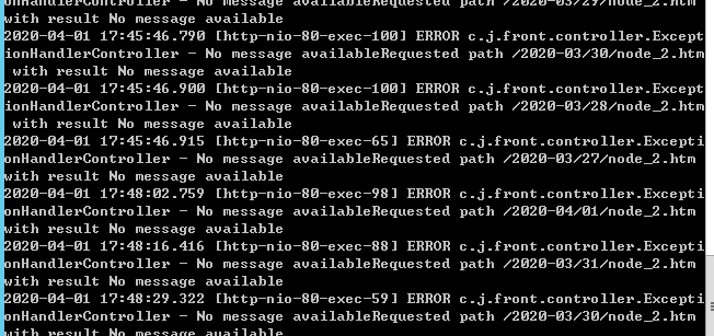 2020-04-01 17:48:02.759 [http-nio-80-exec-98] ERROR c.j.front.controller.ExceptionHandlerController - No message availableRequested path /2020-04/01/node_2.htm with result No message available