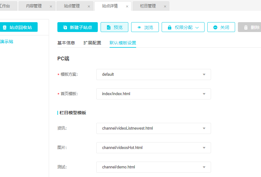 不是在站点里配置 而是去对应的功能下配置 比如 站点的预览您只要配置了对应的首页模板就可以了 其他的像是栏目和内容您要去对应的栏目和内容下进行配置管理 预览读取的是栏目和内容下配置的模板是不会读取站点里的配置信息的