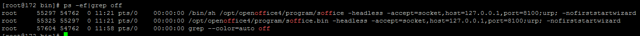 nohup /opt/openoffice4/program/soffice -headless -accept="socket,host=127.0.0.1,port=8100;urp;" -nofirststartwizard & 后台启动 |