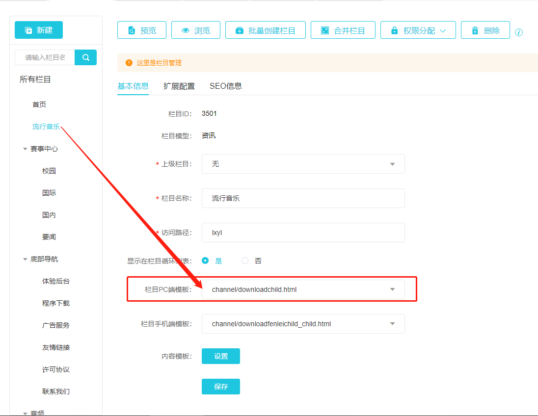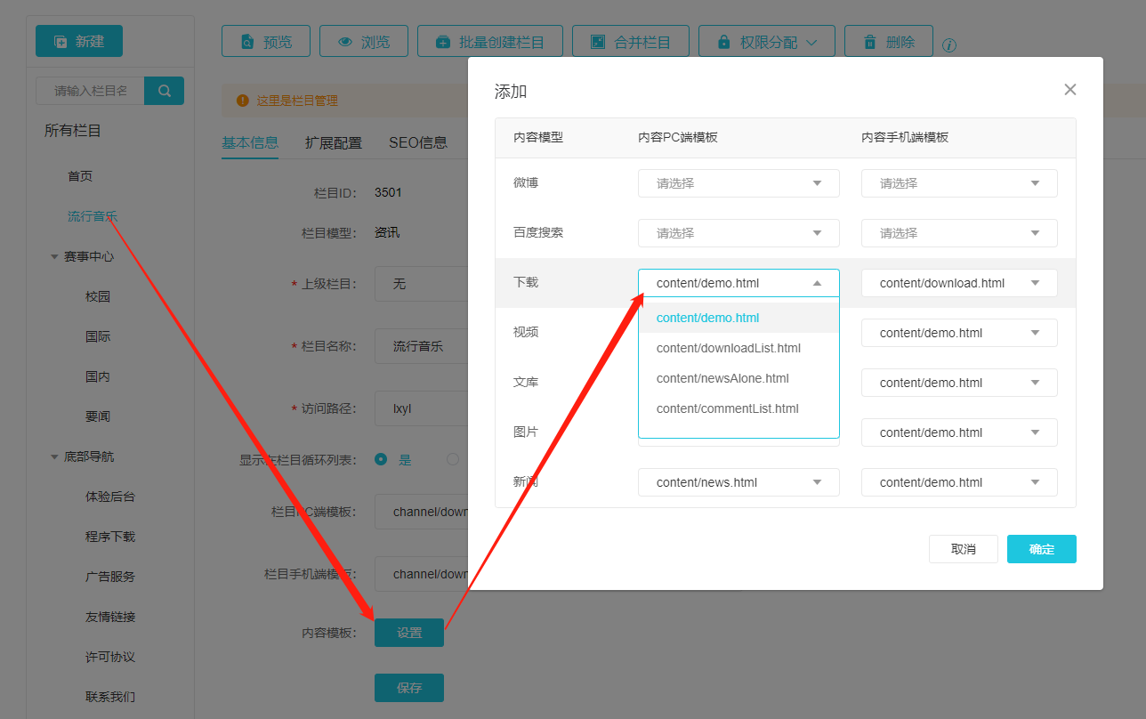就是去您需要选择的模板里 点击进去后在模板名称的边上有个适配模型的功能 配置到这个栏目的模型就可以在这个栏目的内容中找到这个模板了