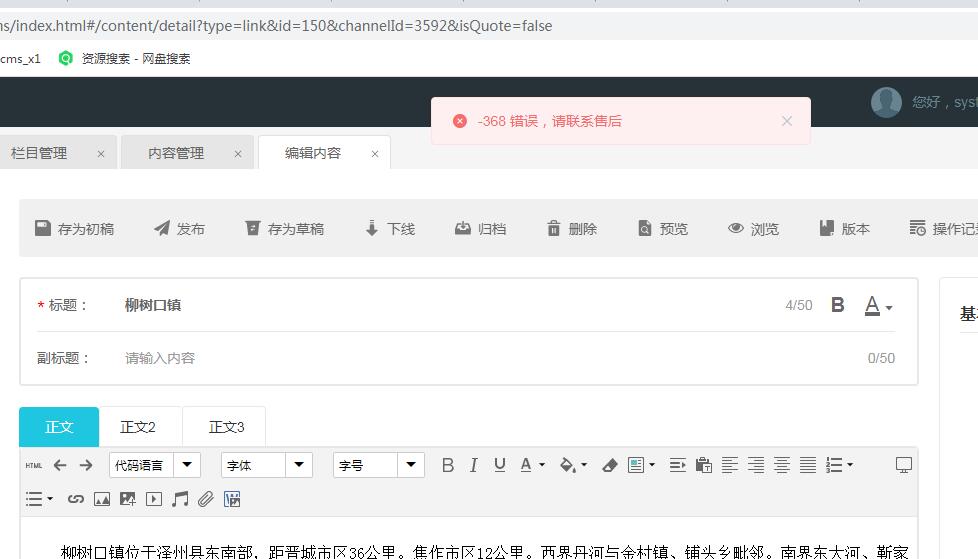 后台有条新闻内容修改时不能保存,保存和发布时提示错误-368错误,截图如图,请问如何解决?
