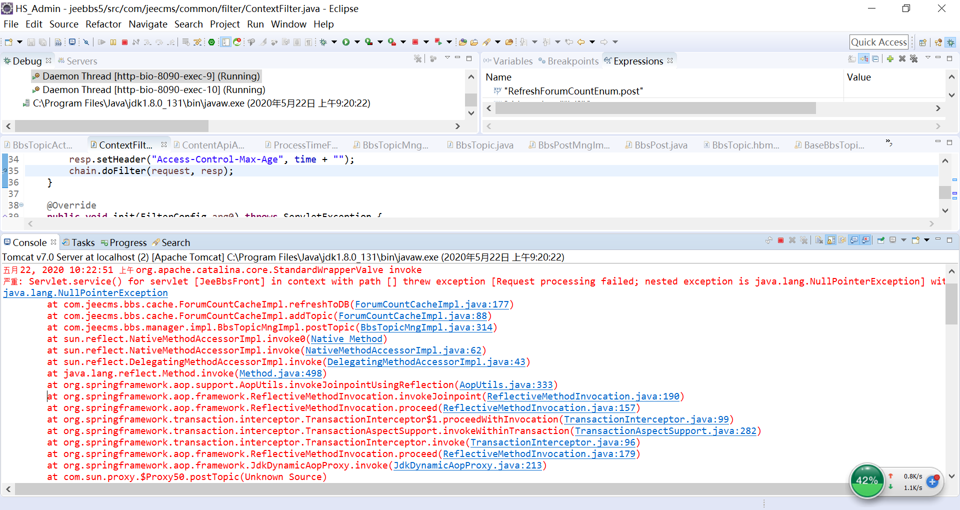 五月 22, 2020 10:22:51 上午 org.apache.catalina.core.StandardWrapperValve invoke 严重: Servlet.service() for servlet [JeeBbsFront] in context with path [] threw exception [Request processing failed; nested exception is java.lang.NullPointerException] with root cause java.lang.NullPointerException at com.jeecms.bbs.cache.ForumCountCacheImpl.refreshToDB(ForumCountCacheImpl.java:177) at com.jeecms.bbs.cache.ForumCountCacheImpl.addTopic(ForumCountCacheImpl.java:88) at com.jeecms.bbs.manager.impl.BbsTopicMngImpl.postTopic(BbsTopicMngImpl.java:314) at sun.reflect.NativeMethodAccessorImpl.invoke0(Native Method) at sun.reflect.NativeMethodAccessorImpl.invoke(NativeMethodAccessorImpl.java:62) at sun.reflect.DelegatingMethodAccessorImpl.invoke(DelegatingMethodAccessorImpl.java:43) at java.lang.reflect.Method.invoke(Method.java:498) at org.springframework.aop.support.AopUtils.invokeJoinpointUsingReflection(AopUtils.java:333) at org.springframework.aop.framework.ReflectiveMethodInvocation.invokeJoinpoint(ReflectiveMethodInvocation.java:190) at org.springframework.aop.framework.ReflectiveMethodInvocation.proceed(ReflectiveMethodInvocation.java:157) at org.springframework.transaction.interceptor.TransactionInterceptor$1.proceedWithInvocation(TransactionInterceptor.java:99) at org.springframework.transaction.interceptor.TransactionAspectSupport.invokeWithinTransaction(TransactionAspectSupport.java:282) at org.springframework.transaction.interceptor.TransactionInterceptor.invoke(TransactionInterceptor.java:96) at org.springframework.aop.framework.ReflectiveMethodInvocation.proceed(ReflectiveMethodInvocation.java:179) at org.springframework.aop.framework.JdkDynamicAopProxy.invoke(JdkDynamicAopProxy.java:213) at com.sun.proxy.$Proxy50.postTopic(Unknown Source) at com.jeecms.bbs.action.front.BbsTopicAct.save(BbsTopicAct.java:208) at sun.reflect.NativeMethodAccessorImpl.invoke0(Native Method) at sun.reflect.NativeMethodAccessorImpl.invoke(NativeMethodAccessorImpl.java:62) at sun.reflect.DelegatingMethodAccessorImpl.invoke(DelegatingMethodAccessorImpl.java:43) at java.lang.reflect.Method.invoke(Method.java:498) at org.springframework.web.bind.annotation.support.HandlerMethodInvoker.invokeHandlerMethod(HandlerMethodInvoker.java:180) at org.springframework.web.servlet.mvc.annotation.AnnotationMethodHandlerAdapter.invokeHandlerMethod(AnnotationMethodHandlerAdapter.java:440) at org.springframework.web.servlet.mvc.annotation.AnnotationMethodHandlerAdapter.handle(AnnotationMethodHandlerAdapter.java:428) at org.springframework.web.servlet.DispatcherServlet.doDispatch(DispatcherServlet.java:967) at org.springframework.web.servlet.DispatcherServlet.doService(DispatcherServlet.java:901) at org.springframework.web.servlet.FrameworkServlet.processRequest(FrameworkServlet.java:970) at org.springframework.web.servlet.FrameworkServlet.doPost(FrameworkServlet.java:872) at javax.servlet.http.HttpServlet.service(HttpServlet.java:647) at org.springframework.web.servlet.FrameworkServlet.service(FrameworkServlet.java:846) at javax.servlet.http.HttpServlet.service(HttpServlet.java:728) at org.apache.catalina.core.ApplicationFilterChain.internalDoFilter(ApplicationFilterChain.java:305) at org.apache.catalina.core.ApplicationFilterChain.doFilter(ApplicationFilterChain.java:210) at org.apache.tomcat.websocket.server.WsFilter.doFilter(WsFilter.java:51) at org.apache.catalina.core.ApplicationFilterChain.internalDoFilter(ApplicationFilterChain.java:243) at org.apache.catalina.core.ApplicationFilterChain.doFilter(ApplicationFilterChain.java:210) at com.jeecms.common.web.XssFilter.doFilter(XssFilter.java:45) at org.apache.catalina.core.ApplicationFilterChain.internalDoFilter(ApplicationFilterChain.java:243) at org.apache.catalina.core.ApplicationFilterChain.doFilter(ApplicationFilterChain.java:210) at org.springframework.orm.hibernate4.support.OpenSessionInViewFilter.doFilterInternal(OpenSessionInViewFilter.java:151) at org.springframework.web.filter.OncePerRequestFilter.doFilter(OncePerRequestFilter.java:107) at org.apache.catalina.core.ApplicationFilterChain.internalDoFilter(ApplicationFilterChain.java:243) at org.apache.catalina.core.ApplicationFilterChain.doFilter(ApplicationFilterChain.java:210) at org.springframework.web.filter.CharacterEncodingFilter.doFilterInternal(CharacterEncodingFilter.java:197) at org.springframework.web.filter.OncePerRequestFilter.doFilter(OncePerRequestFilter.java:107) at org.apache.catalina.core.ApplicationFilterChain.internalDoFilter(ApplicationFilterChain.java:243) at org.apache.catalina.core.ApplicationFilterChain.doFilter(ApplicationFilterChain.java:210) at com.jeecms.common.web.ProcessTimeFilter.doFilter(ProcessTimeFilter.java:38) at org.apache.catalina.core.ApplicationFilterChain.internalDoFilter(ApplicationFilterChain.java:243) at org.apache.catalina.core.ApplicationFilterChain.doFilter(ApplicationFilterChain.java:210) at org.apache.shiro.web.servlet.AbstractShiroFilter.executeChain(AbstractShiroFilter.java:449) at org.apache.shiro.web.servlet.AbstractShiroFilter$1.call(AbstractShiroFilter.java:365) at org.apache.shiro.subject.support.SubjectCallable.doCall(SubjectCallable.java:90) at org.apache.shiro.subject.support.SubjectCallable.call(SubjectCallable.java:83) at org.apache.shiro.subject.support.DelegatingSubject.execute(DelegatingSubject.java:383) at org.apache.shiro.web.servlet.AbstractShiroFilter.doFilterInternal(AbstractShiroFilter.java:362) at org.apache.shiro.web.servlet.OncePerRequestFilter.doFilter(OncePerRequestFilter.java:125) at org.springframework.web.filter.DelegatingFilterProxy.invokeDelegate(DelegatingFilterProxy.java:346) at org.springframework.web.filter.DelegatingFilterProxy.doFilter(DelegatingFilterProxy.java:262) at org.apache.catalina.core.ApplicationFilterChain.internalDoFilter(ApplicationFilterChain.java:243) at org.apache.catalina.core.ApplicationFilterChain.doFilter(ApplicationFilterChain.java:210) at com.jeecms.common.filter.ContextFilter.doFilter(ContextFilter.jav