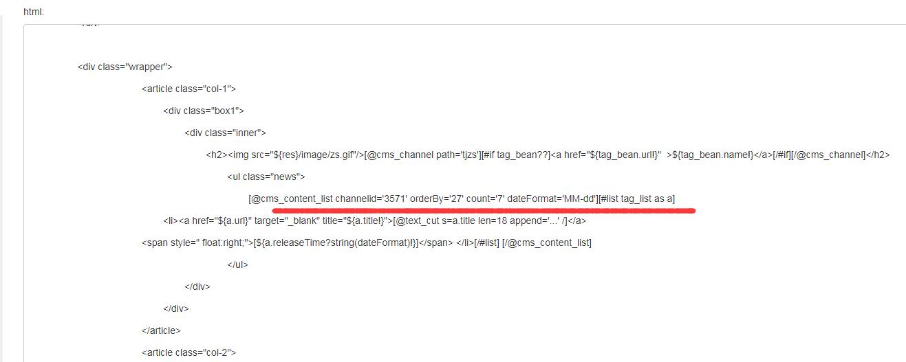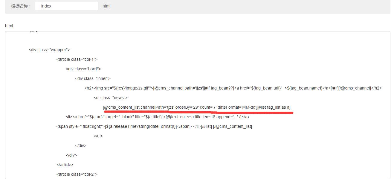 <div class="box1"> <div class="inner"> <h2><img src="${res}/image/zs.gif"/>[@cms_channel path='tjzs'][#if tag_bean??]<a href="${tag_bean.url!}" >${tag_bean.name!}</a>[/#if][/@cms_channel]</h2> <ul class="news"> [@cms_content_list channelid='3571' orderBy='27' count='7' dateFormat='MM-dd'][#list tag_list as a] <li><a href="${a.url}" target="_blank" title="${a.title!}">[@text_cut s=a.title len=18 append='...' /]</a> <span style=" float:right;">[${a.releaseTime?string(dateFormat)!}]</span> </li>[/#list] [/@cms_content_list] </ul> </div> </div> </article> 以上是修改后的代码,下面是修改后的显示截图。 ![]() ![]() |