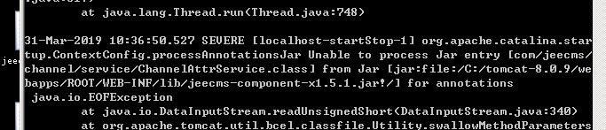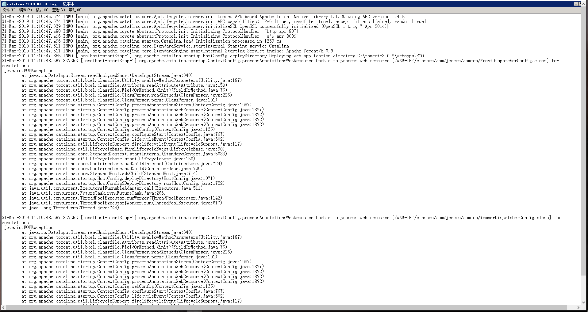 31-Mar-2019 11:10:46.574 INFO [main] org.apache.catalina.core.AprLifecycleListener.init Loaded APR based Apache Tomcat Native library 1.1.30 using APR version 1.4.8. 31-Mar-2019 11:10:46.574 INFO [main] org.apache.catalina.core.AprLifecycleListener.init APR capabilities: IPv6 [true], sendfile [true], accept filters [false], random [true]. 31-Mar-2019 11:10:47.339 INFO [main] org.apache.catalina.core.AprLifecycleListener.initializeSSL OpenSSL successfully initialized (OpenSSL 1.0.1g 7 Apr 2014) 31-Mar-2019 11:10:47.480 INFO [main] org.apache.coyote.AbstractProtocol.init Initializing ProtocolHandler ["http-apr-80"] 31-Mar-2019 11:10:47.496 INFO [main] org.apache.coyote.AbstractProtocol.init Initializing ProtocolHandler ["ajp-apr-8009"] 31-Mar-2019 11:10:47.496 INFO [main] org.apache.catalina.startup.Catalina.load Initialization processed in 1233 ms 31-Mar-2019 11:10:47.511 INFO [main] org.apache.catalina.core.StandardService.startInternal Starting service Catalina 31-Mar-2019 11:10:47.511 INFO [main] org.apache.catalina.core.StandardEngine.startInternal Starting Servlet Engine: Apache Tomcat/8.0.9 31-Mar-2019 11:10:47.855 INFO [localhost-startStop-1] org.apache.catalina.startup.HostConfig.deployDirectory Deploying web application directory C:\tomcat-8.0.9\webapps\ROOT 31-Mar-2019 11:10:48.667 SEVERE [localhost-startStop-1] org.apache.catalina.startup.ContextConfig.processAnnotationsWebResource Unable to process web resource [/WEB-INF/classes/com/jeecms/common/FrontDispatcherConfig.class] for annotations java.io.EOFException at java.io.DataInputStream.readUnsignedShort(DataInputStream.java:340) at org.apache.tomcat.util.bcel.classfile.Utility.swallowMethodParameters(Utility.java:187) at org.apache.tomcat.util.bcel.classfile.Attribute.readAttribute(Attribute.java:159) at org.apache.tomcat.util.bcel.classfile.FieldOrMethod.<init>(FieldOrMethod.java:76) at org.apache.tomcat.util.bcel.classfile.ClassParser.readMethods(ClassParser.java:226) at org.apache.tomcat.util.bcel.classfile.ClassParser.parse(ClassParser.java:101) at org.apache.catalina.startup.ContextConfig.processAnnotationsStream(ContextConfig.java:1987) at org.apache.catalina.startup.ContextConfig.processAnnotationsWebResource(ContextConfig.java:1897) at org.apache.catalina.startup.ContextConfig.processAnnotationsWebResource(ContextConfig.java:1892) at org.apache.catalina.startup.ContextConfig.processAnnotationsWebResource(ContextConfig.java:1892) at org.apache.catalina.startup.ContextConfig.processAnnotationsWebResource(ContextConfig.java:1892) at org.apache.catalina.startup.ContextConfig.webConfig(ContextConfig.java:1135) at org.apache.catalina.startup.ContextConfig.configureStart(ContextConfig.java:767) at org.apache.catalina.startup.ContextConfig.lifecycleEvent(ContextConfig.java:302) at org.apache.catalina.util.LifecycleSupport.fireLifecycleEvent(LifecycleSupport.java:117) at org.apache.catalina.util.LifecycleBase.fireLifecycleEvent(LifecycleBase.java:90) at org.apache.catalina.core.StandardContext.startInternal(StandardContext.java:5083) at org.apache.catalina.util.LifecycleBase.start(LifecycleBase.java:150) at org.apache.catalina.core.ContainerBase.addChildInternal(ContainerBase.java:724) at org.apache.catalina.core.ContainerBase.addChild(ContainerBase.java:700) at org.apache.catalina.core.StandardHost.addChild(StandardHost.java:714) at org.apache.catalina.startup.HostConfig.deployDirectory(HostConfig.java:1071) at org.apache.catalina.startup.HostConfig$DeployDirectory.run(HostConfig.java:1722) at java.util.concurrent.Executors$RunnableAdapter.call(Executors.java:511) at java.util.concurrent.FutureTask.run(FutureTask.java:266) at java.util.concurrent.ThreadPoolExecutor.runWorker(ThreadPoolExecutor.java:1142) at java.util.concurrent.ThreadPoolExecutor$Worker.run(ThreadPoolExecutor.java:617) at java.lang.Thread.run(Thread.java:748) 31-Mar-2019 11:10:48.667 SEVERE [localhost-startStop-1] org.apache.catalina.startup.ContextConfig.processAnnotationsWebResource Unable to process web resource [/WEB-INF/classes/com/jeecms/common/MemberDispatcherConfig.class] for annotations java.io.EOFException at java.io.DataInputStream.readUnsignedShort(DataInputStream.java:340) at org.apache.tomcat.util.bcel.classfile.Utility.swallowMethodParameters(Utility.java:187) at org.apache.tomcat.util.bcel.classfile.Attribute.readAttribute(Attribute.java:159) at org.apache.tomcat.util.bcel.classfile.FieldOrMethod.<init>(FieldOrMethod.java:76) at org.apache.tomcat.util.bcel.classfile.ClassParser.readMethods(ClassParser.java:226) at org.apache.tomcat.util.bcel.classfile.ClassParser.parse(ClassParser.java:101) at org.apache.catalina.startup.ContextConfig.processAnnotationsStream(ContextConfig.java:1987) at org.apache.catalina.startup.ContextConfig.processAnnotationsWebResource(ContextConfig.java:1897) at org.apache.catalina.startup.ContextConfig.processAnnotationsWebResource(ContextConfig.java:1892) at org.apache.catalina.startup.ContextConfig.processAnnotationsWebResource(ContextConfig.java:1892) at org.apache.catalina.startup.ContextConfig.processAnnotationsWebResource(ContextConfig.java:1892) at org.apache.catalina.startup.ContextConfig.webConfig(ContextConfig.java:1135) at org.apache.catalina.startup.ContextConfig.configureStart(ContextConfig.java:767) at org.apache.catalina.startup.ContextConfig.lifecycleEvent(ContextConfig.java:302) at org.apache.catalina.util.LifecycleSupport.fireLifecycleEvent(LifecycleSupport.java:117) at org.apache.catalina.util.LifecycleBase.fireLifecycleEvent(LifecycleBase.java:90) at org.apache.catalina.core.StandardContext.startInternal(StandardContext.java:5083) at org.apache.catalina.util.LifecycleBase.start(LifecycleBase.java:150) at org.apache.catalina.core.ContainerBase.addChildInternal(ContainerBase.java:724) at org.apache.catalina.core.ContainerBase.addChild(ContainerBase.java:700) at org.apache.catalina.core.StandardHost.addChild(StandardHost.java:714) at org.apache.catalina.startup.HostConfig.deployDirectory(HostConfig.jav