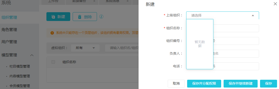 组织不能设置,这样相对的角色、用户都不能设置。。。。