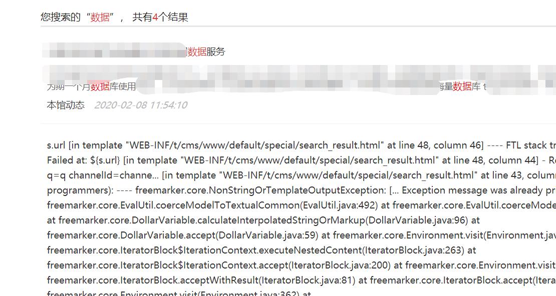 s.url [in template "WEB-INF/t/cms/www/default/special/search_result.html" at line 48, column 46] ---- FTL stack trace ("~" means nesting-related): - Failed at: ${s.url} [in template "WEB-INF/t/cms/www/default/special/search_result.html" at line 48, column 44] - Reached through: @cms_lucene_page q=q channelId=channe... [in template "WEB-INF/t/cms/www/default/special/search_result.html" at line 43, column 5] ---- Java stack trace (for programmers): ---- freemarker.core.NonStringOrTemplateOutputException: [... Exception message was already printed; see it above ...] at freemarker.core.EvalUtil.coerceModelToTextualCommon(EvalUtil.java:492) at freemarker.core.EvalUtil.coerceModelToStringOrMarkup(EvalUtil.java:374) at freemarker.core.DollarVariable.calculateInterpolatedStringOrMarkup(DollarVariable.java:96) at freemarker.core.DollarVariable.accept(DollarVariable.java:59) at freemarker.core.Environment.visit(Environment.java:362) at freemarker.core.IteratorBlock$IterationContext.executeNestedContent(IteratorBlock.java:263) at freemarker.core.IteratorBlock$IterationContext.accept(IteratorBlock.java:200) at freemarker.core.Environment.visitIteratorBlock(Environment.java:595) at freemarker.core.IteratorBlock.acceptWithResult(IteratorBlock.java:81) at freemarker.core.IteratorBlock.accept(IteratorBlock.java:67) at freemarker.core.Environment.visit(Environment.java:362) at freemarker.core.Environment$NestedElementTemplateDirectiveBody.render(Environment.java:2727) at com.jeecms.cms.lucene.LuceneDirectivePage.execute(LuceneDirectivePage.java:86) at freemarker.core.Environment.visit(Environment.java:426) at freemarker.core.UnifiedCall.accept(UnifiedCall.java:101) at freemarker.core.Environment.visit(Environment.java:326) at freemarker.core.Environment.visit(Environment.java:332) at freemarker.core.Environment.visit(Environment.java:332) at freemarker.core.Environment.process(Environment.java:305) at freemarker.template.Template.process(Template.java:384) at com.jeecms.common.web.springmvc.SimpleFreeMarkerView.renderMergedTemplateModel(SimpleFreeMarkerView.java:114) at org.springframework.web.servlet.view.AbstractTemplateView.renderMergedOutputModel(AbstractTemplateView.java:167) at org.springframework.web.servlet.view.AbstractView.render(AbstractView.java:303) at org.springframework.web.servlet.DispatcherServlet.render(DispatcherServlet.java:1257) at org.springframework.web.servlet.DispatcherServlet.processDispatchResult(DispatcherServlet.java:1037) at org.springframework.web.servlet.DispatcherServlet.doDispatch(DispatcherServlet.java:980) at org.springframework.web.servlet.DispatcherServlet.doService(DispatcherServlet.java:897) at org.springframework.web.servlet.FrameworkServlet.processRequest(FrameworkServlet.java:970) at org.springframework.web.servlet.FrameworkServlet.doGet(FrameworkServlet.java:861) at javax.servlet.http.HttpServlet.service(HttpServlet.java:635) at org.springframework.web.servlet.FrameworkServlet.service(FrameworkServlet.java:846) at javax.servlet.http.HttpServlet.service(HttpServlet.java:742) at org.apache.catalina.core.ApplicationFilterChain.internalDoFilter(ApplicationFilterChain.java:230) at org.apache.catalina.core.ApplicationFilterChain.doFilter(ApplicationFilterChain.java:165) at org.apache.tomcat.websocket.server.WsFilter.doFilter(WsFilter.java:53) at org.apache.catalina.core.ApplicationFilterChain.internalDoFilter(ApplicationFilterChain.java:192) at org.apache.catalina.core.ApplicationFilterChain.doFilter(ApplicationFilterChain.java:165) at com.jeecms.common.web.XssFilter.doFilter(XssFilter.java:40) at org.apache.catalina.core.ApplicationFilterChain.internalDoFilter(ApplicationFilterChain.java:192) at org.apache.catalina.core.ApplicationFilterChain.doFilter(ApplicationFilterChain.java:165) at org.apache.shiro.web.servlet.AbstractShiroFilter.executeChain(AbstractShiroFilter.java:449) at org.apache.shiro.web.servlet.AbstractShiroFilter$1.call(AbstractShiroFilter.java:365) at org.apache.shiro.subject.support.SubjectCallable.doCall(SubjectCallable.java:90) at org.apache.shiro.subject.support.SubjectCallable.call(SubjectCallable.java:83) at org.apache.shiro.subject.support.DelegatingSubject.execute(DelegatingSubject.java:383) at org.apache.shiro.web.servlet.AbstractShiroFilter.doFilterInternal(AbstractShiroFilter.java:362) at org.apache.shiro.web.servlet.OncePerRequestFilter.doFilter(OncePerRequestFilter.java:125) at org.springframework.web.filter.DelegatingFilterProxy.invokeDelegate(DelegatingFilterProxy.java:346) at org.springframework.web.filter.DelegatingFilterProxy.doFilter(DelegatingFilterProxy.java:262) at org.apache.catalina.core.ApplicationFilterChain.internalDoFilter(ApplicationFilterChain.java:192) at org.apache.catalina.core.ApplicationFilterChain.doFilter(ApplicationFilterChain.java:165) at org.springframework.orm.hibernate4.support.OpenSessionInViewFilter.doFilterInternal(OpenSessionInViewFilter.java:151) at org.springframework.web.filter.OncePerRequestFilter.doFilter(OncePerRequestFilter.java:107) at org.apache.catalina.core.ApplicationFilterChain.internalDoFilter(ApplicationFilterChain.java:192) at org.apache.catalina.core.ApplicationFilterChain.doFilter(ApplicationFilterChain.java:165) at org.springframework.web.filter.CharacterEncodingFilter.doFilterInternal(CharacterEncodingFilter.java:197) at org.springframework.web.filter.OncePerRequestFilter.doFilter(OncePerRequestFilter.java:107) at org.apache.catalina.core.ApplicationFilterChain.internalDoFilter(ApplicationFilterChain.java:192) at org.apache.catalina.core.ApplicationFilterChain.doFilter(ApplicationFilterChain.java:165) at com.jeecms.common.web.ProcessTimeFilter.doFilter(ProcessTimeFilter.java:35) at org.apache.catalina.core.ApplicationFilterChain.internalDoFilter(ApplicationFilterChain.java:192) at org.apache.catalina.core.ApplicationFilterChain.doFilter(ApplicationFilterChain.java:165) at org.apache.catalina.core.StandardWrapperValve.invoke(StandardWrapperValve.java:199) at org.apache.catalina.core.Sta
